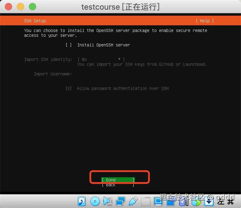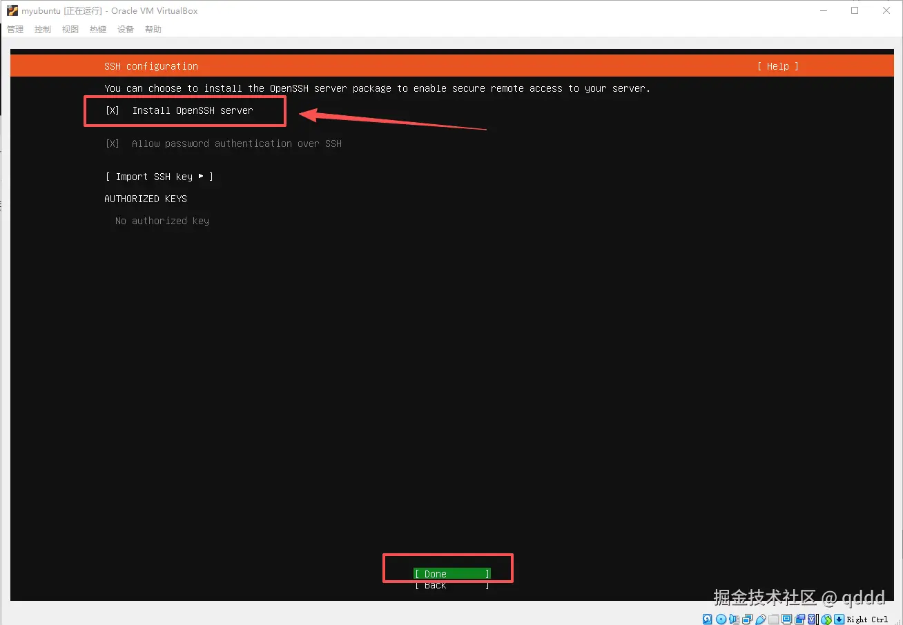 选择把Install OpenSSH server安装上,按回车就选中了,然后将光标移动到Done下,然后回车