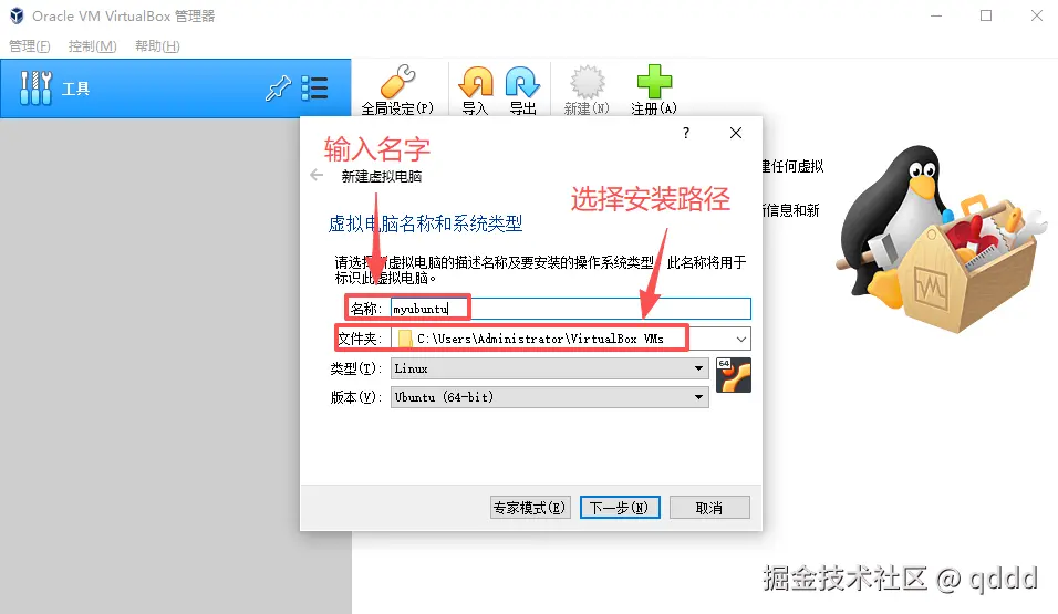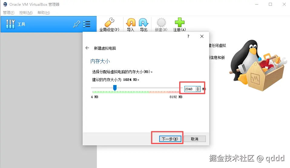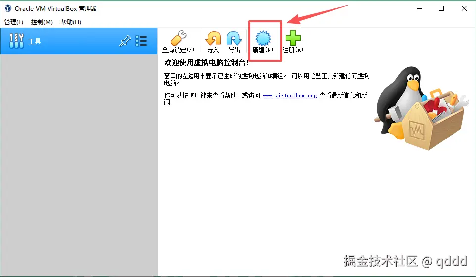 下载安装成功后,打开VirtualBox,在virtual box上点击新建后