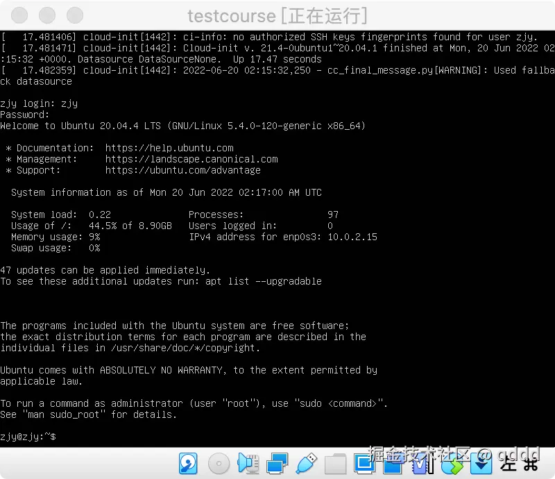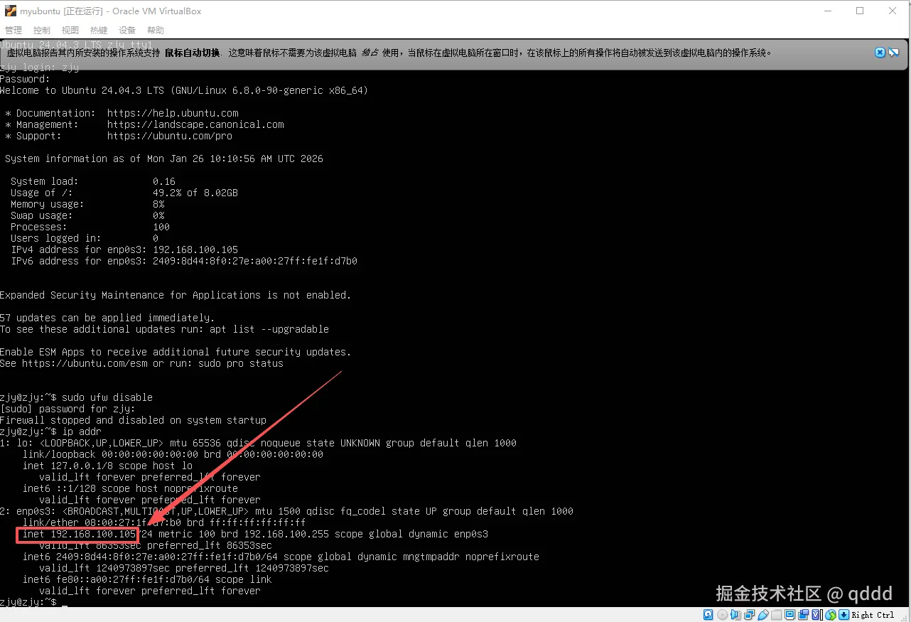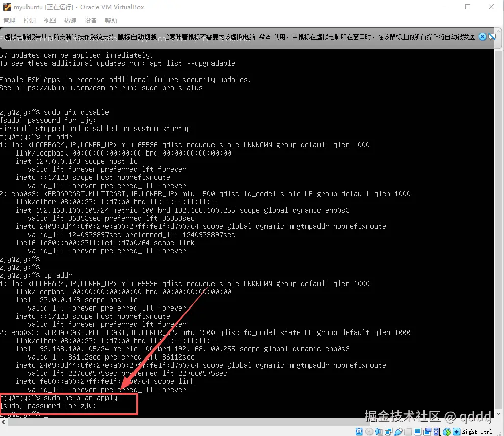 如果你前边安装的时候,忘记勾选了那个Install OpenSSH server 你需要安装SSH远程连接的服务,命令:sudo apt install openssh-server,输入密码,遇到需要确认则按y,如果安装了,这个步骤就不用做了