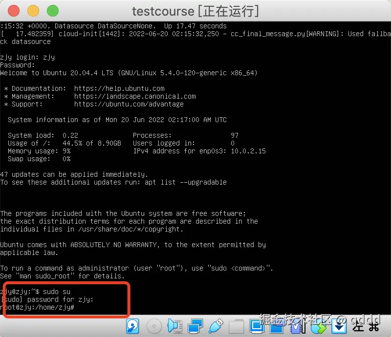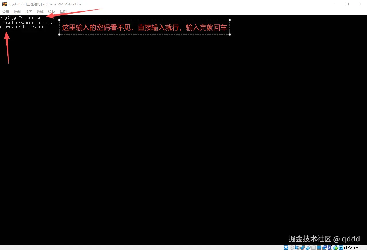 我们切换到root用户上,命令是sudo su,然后输入密码