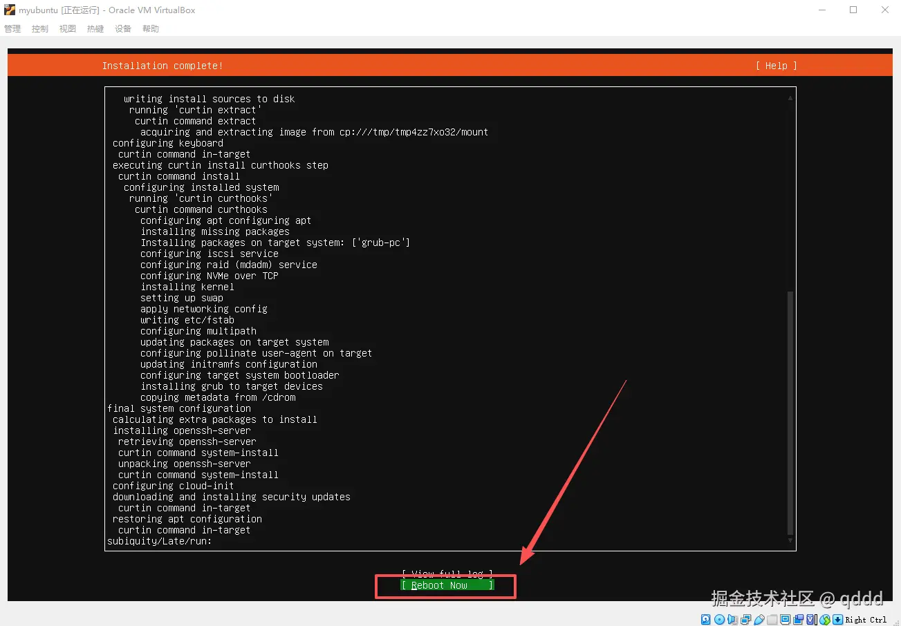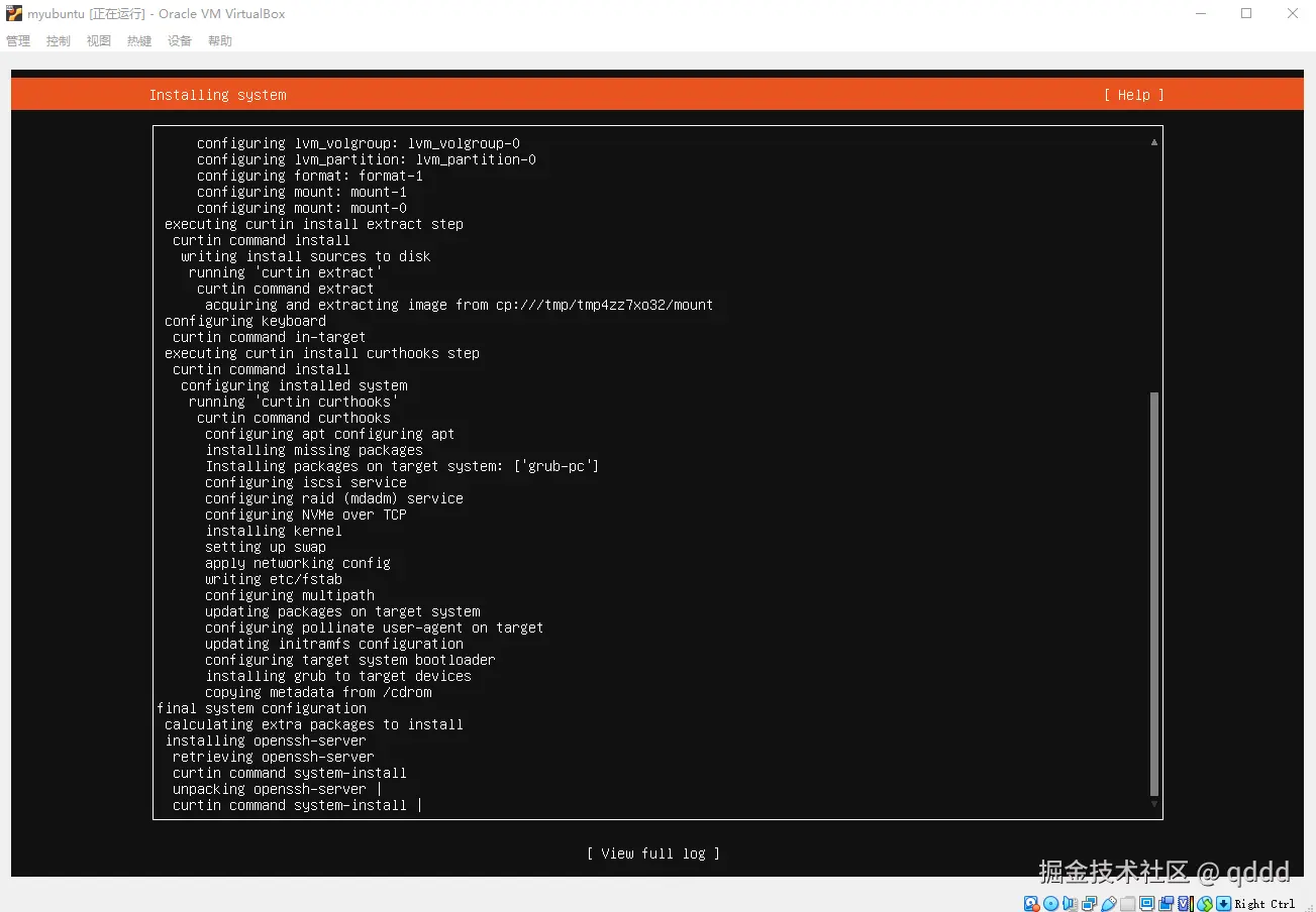 如果等待的无聊,也可以按**”下“**按键将光标移动到”View full log“上,查看一下完整的日志,至少这里的日志会动,看起来它确实在工作。