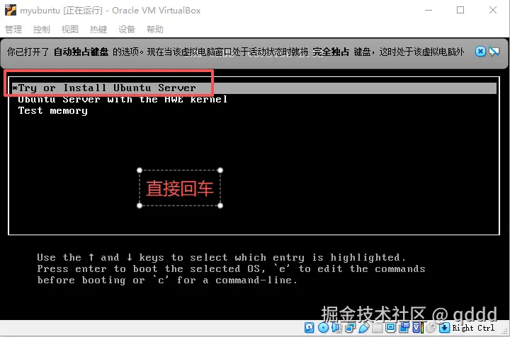 鼠标选中虚拟机后,直接回车即可