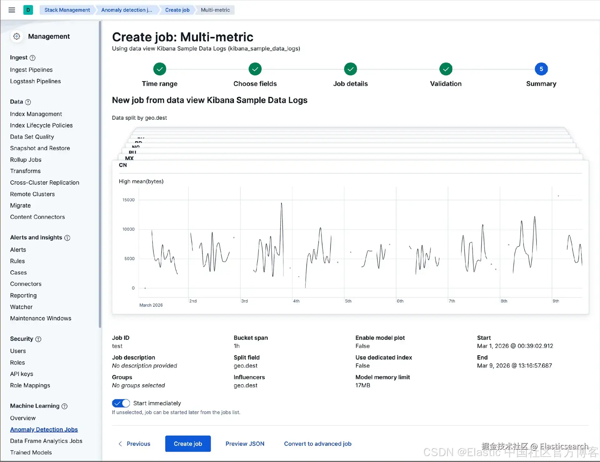 我们将构建一个用于检测异常大响应大小的作业:对 bytes 使用 high_mean,并按目标国家( geo.dest )进行分区,bucket span 为 1 小时。