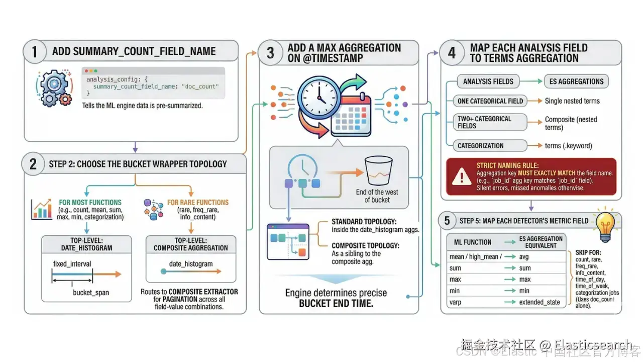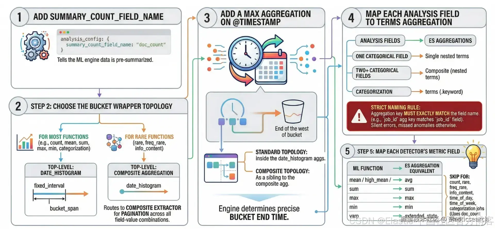 categorization 可以与 aggregated datafeeds 一起使用:summary_count_field_name 和 categorization_field_name 可以在同一个作业中共存。五步模式可以直接应用。步骤 2 使用标准的 date_histogram 拓扑结构。步骤 4 有一个调整:不再使用 partition 字段,而是对文本字段本身使用 terms 聚合,并在其 .keyword 子字段上执行,名称必须与 categorization_field_name 完全一致。步骤 5 可以跳过,因为 count detector 只依赖 doc_count。