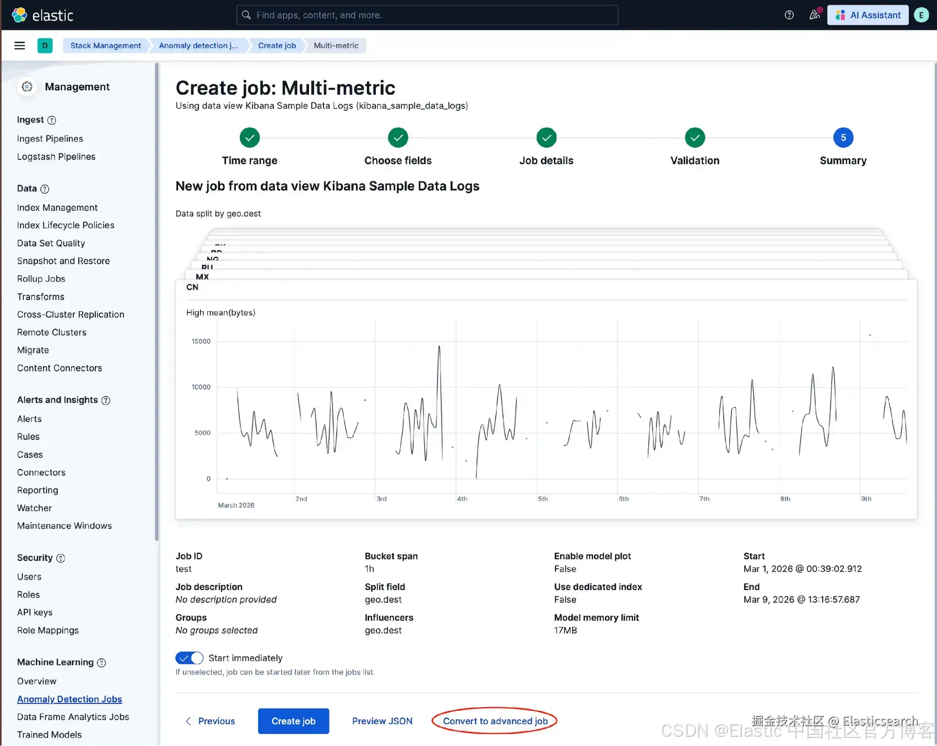 不要点击 Create,而是点击 Convert to advanced job。这样会保留你刚刚配置的所有内容(detector、partition 字段、bucket span),并直接进入 Advanced Wizard,在那里我们可以应用五步模式。