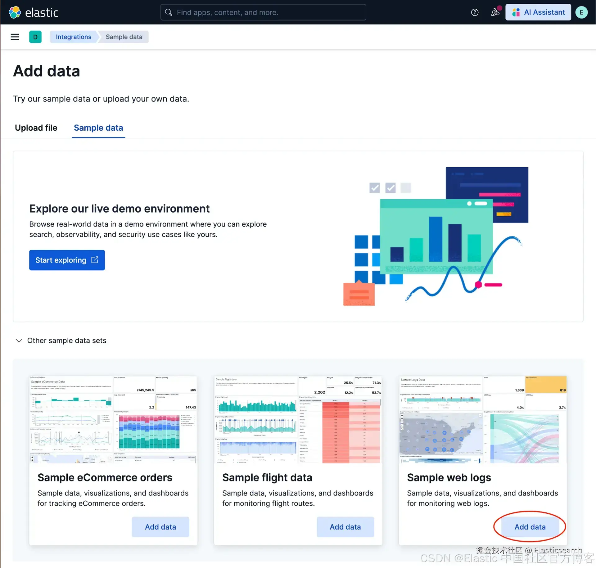 让我们用 Kibana 的 sample web logs 从头构建一个完整流程。如果你还没有加载这些数据,可以进入 Kibana 首页,点击 Integrations → Sample data → Sample web logs → Add data。这会提供一个名为 Kibana Sample Data Logs 的 data view,以及一个名为 kibana_sample_data_logs 的 index,其中包含 @timestamp、bytes(响应大小)以及 geo.dest(目标国家)等字段。