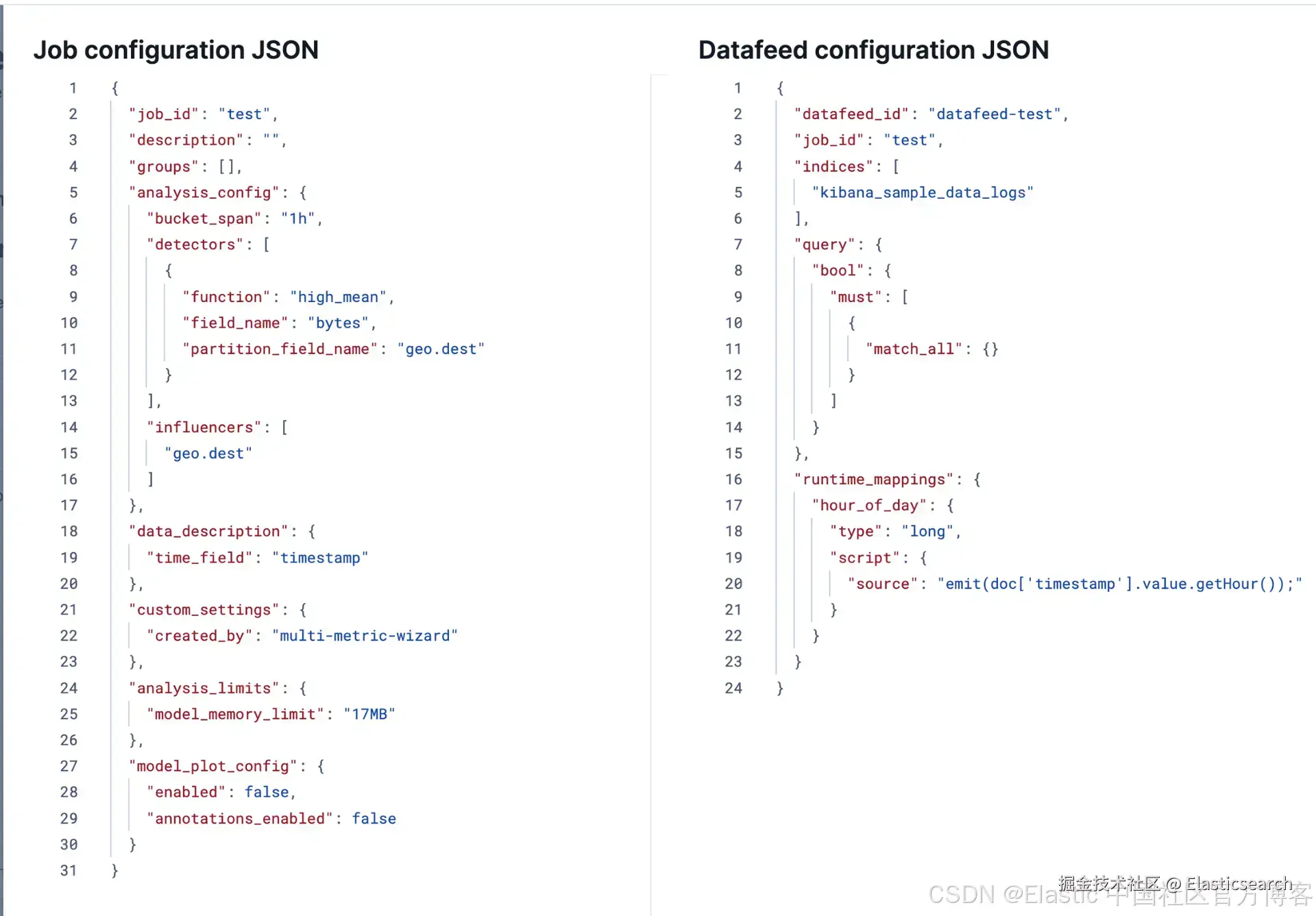 如果你想添加 partition_field_name(例如按 service 建模一天中的时间模式),可以在 histogram 的 aggregations 中按照标准步骤 4 的模式加入 terms 聚合。