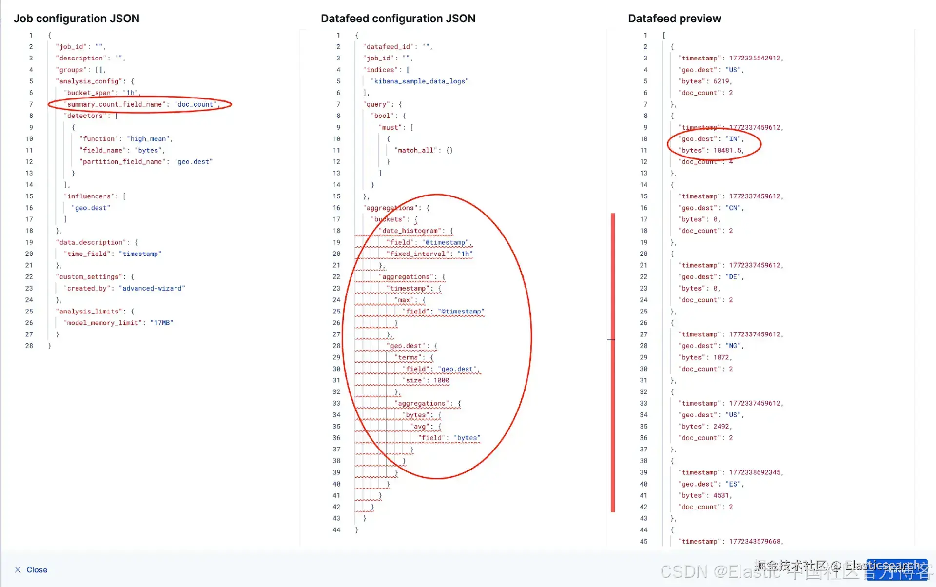 步骤 1:在 analysis 配置中添加 summary_count_field_name: ["doc_count"](www.elastic.co/docs/refere… ""doc_count"")。这会告诉 ML 引擎输入数据已经是预先汇总的。如果不这样做,引擎会把每个聚合后的 bucket 当作一条原始文档,从而导致错误的异常评分。