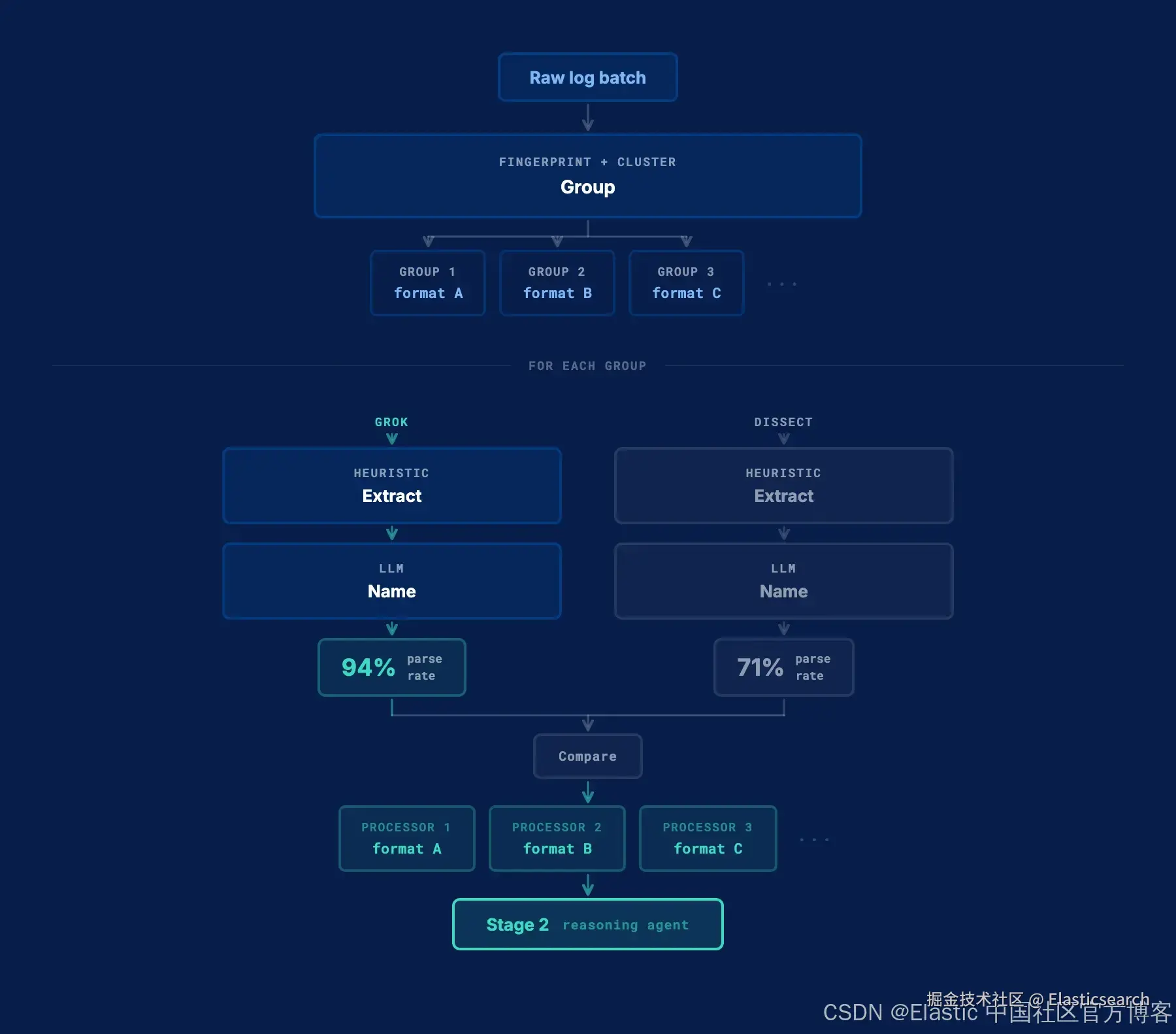 Streams 只需一次点击就能生成一个完整、经过测试的日志处理 pipeline。其背后的机制分为两个阶段:确定性指纹匹配( deterministic fingerprinting ),以及一个基于真实数据反复迭代的 reasoning agent,同时通过严格的验证阈值在结果展示前保证质量。