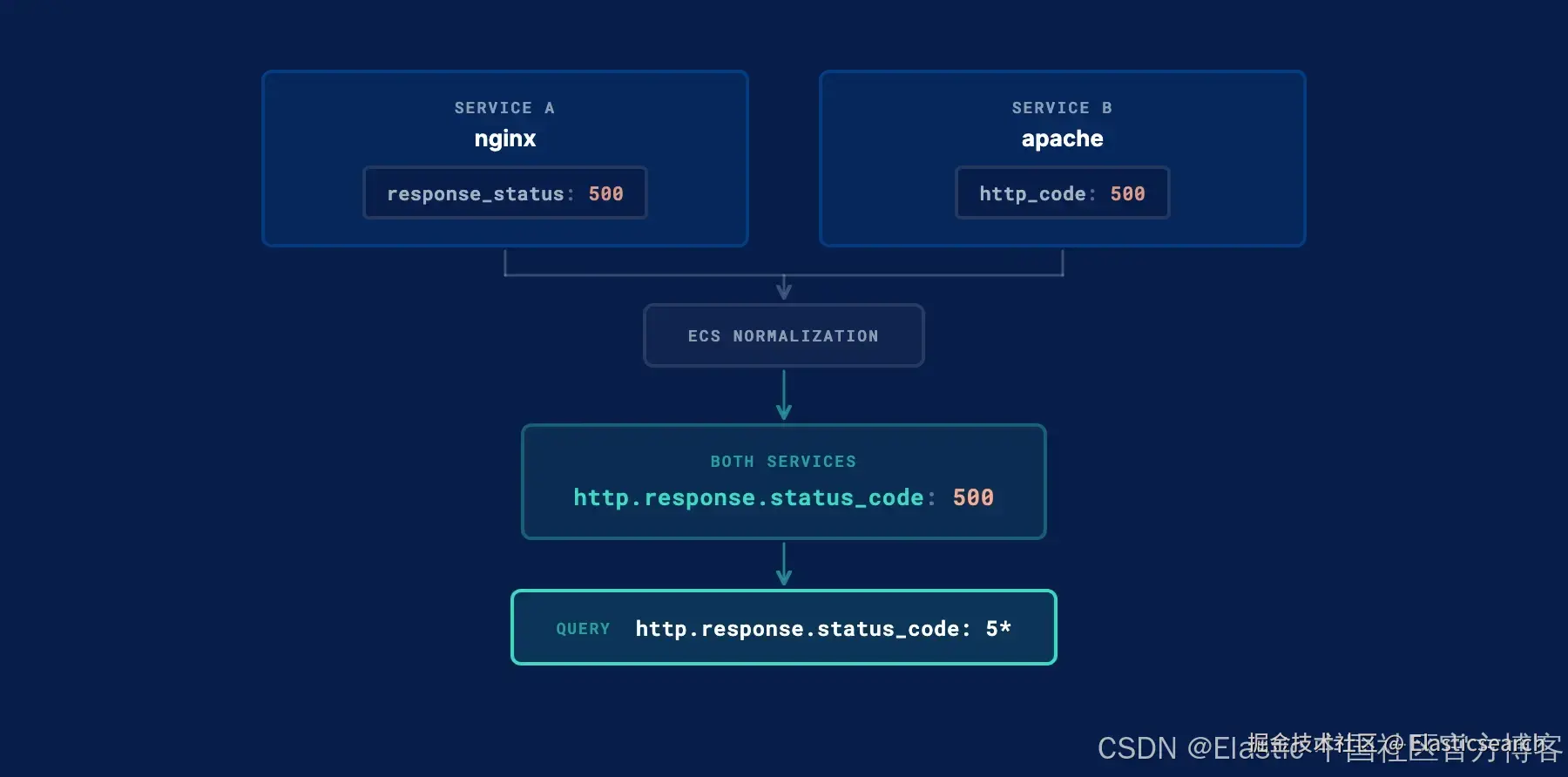 如果两个服务都在记录 HTTP 请求,但使用了不同的字段名(例如一个用 response_status,另一个用 http_code),那么针对 http.response.status_code: 5* 的查询在两者中都会得不到结果。Schema normalization 的作用就是将这些不同字段统一映射到标准名称:
