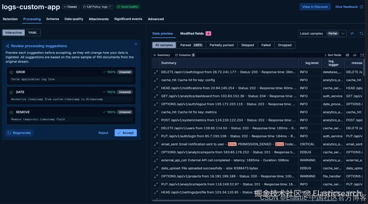 生成的处理器会在你提交的文档上进行模拟,以衡量其解析率。Grok 表达能力更强,支持类型化字段、命名捕获以及多个子模式,但最大的缺点是速度较慢。相比之下,Dissect 更快,但仅限于基于固定位置的拆分。简单的日志格式通常可以用 dissect 干净地解析;复杂的则需要 grok。