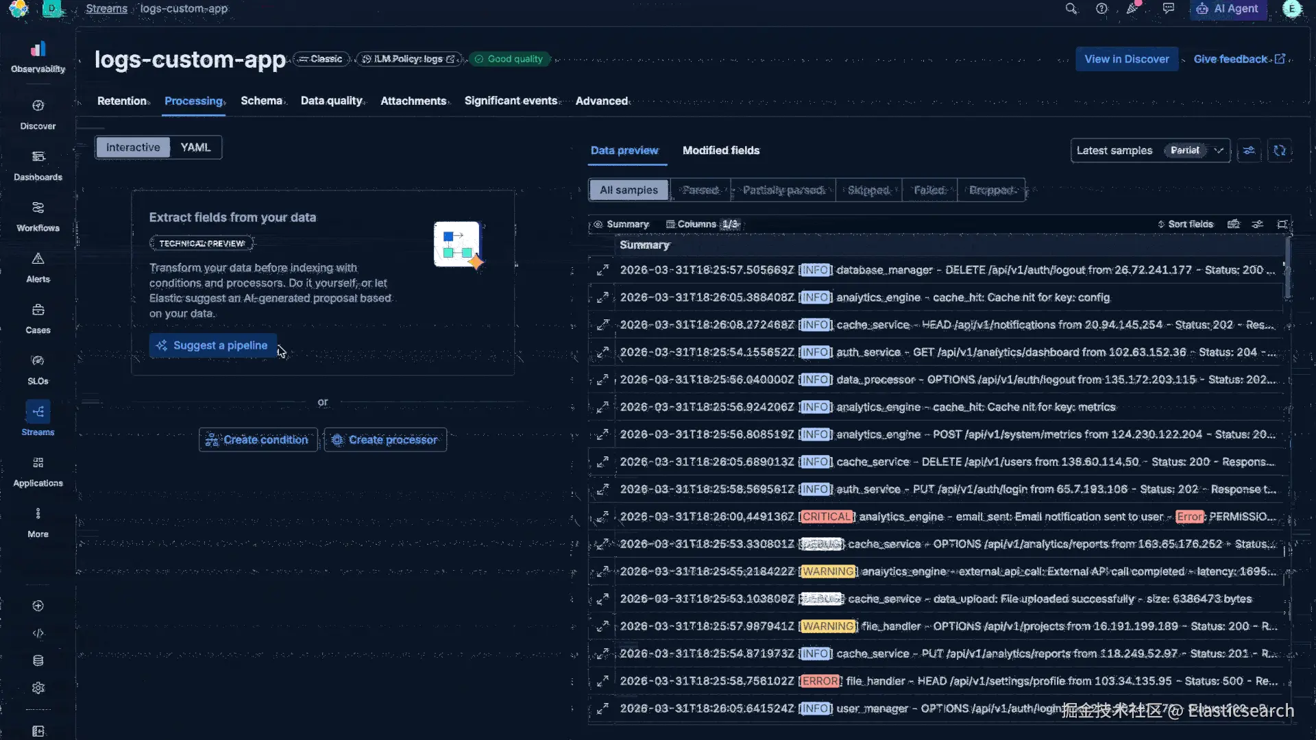 只需点击 Kibana Processing 标签中的 Suggest pipeline 按钮,几秒钟内你就会看到一个完整的 pipeline(Grok 模式、日期 标准化 、类型转换),并附带你的真实日志文档在该 pipeline 中的解析预览。