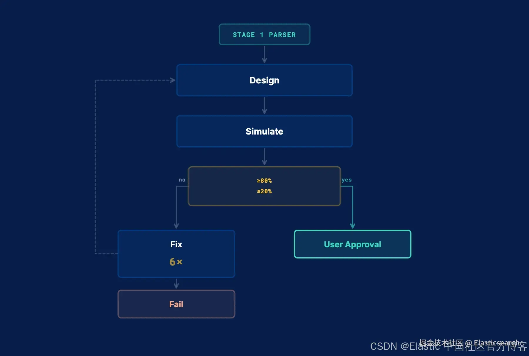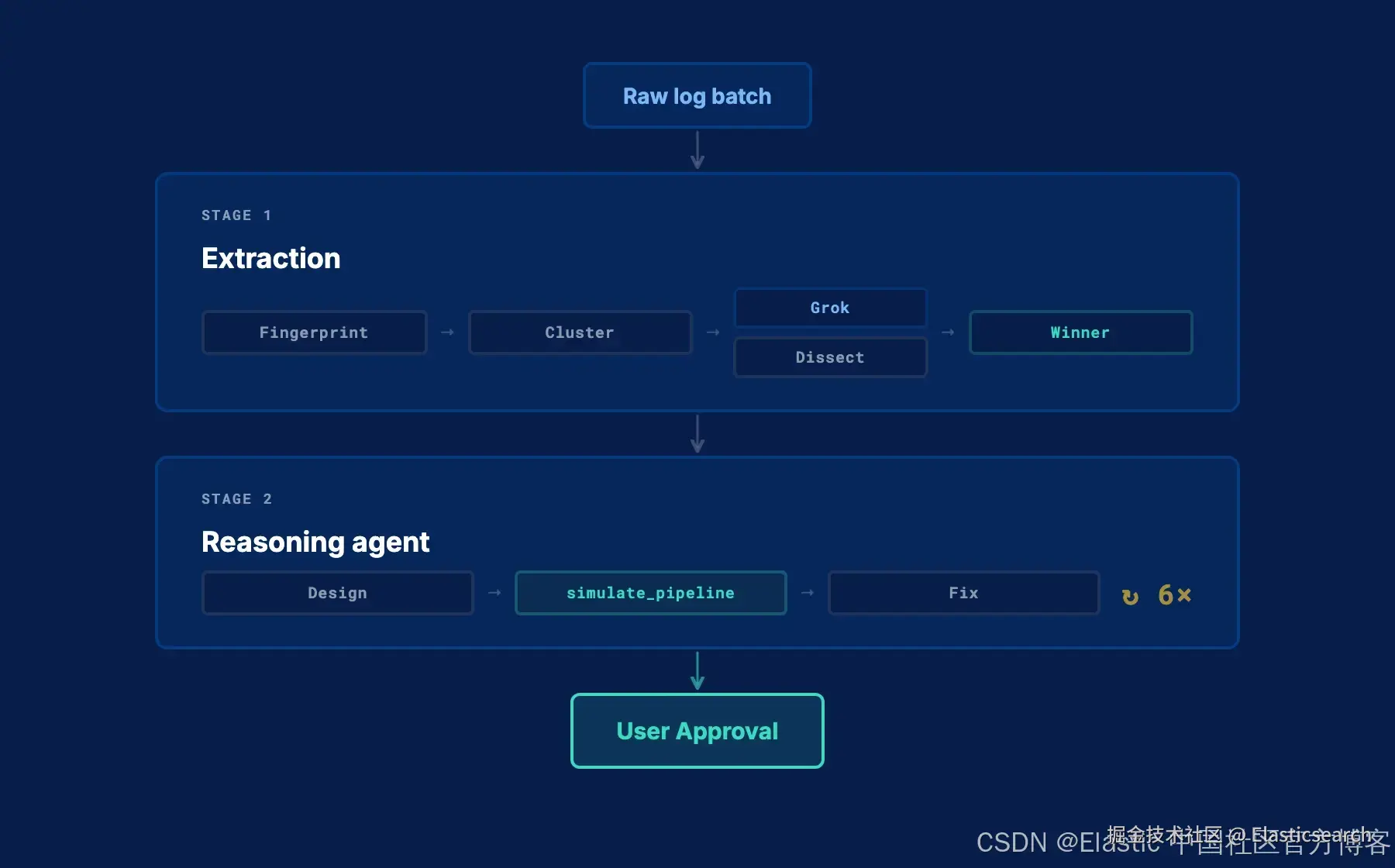 阶段 1 会生成一个解析处理器;阶段 2 则将其转化为一个完整且经过验证的 pipeline。
