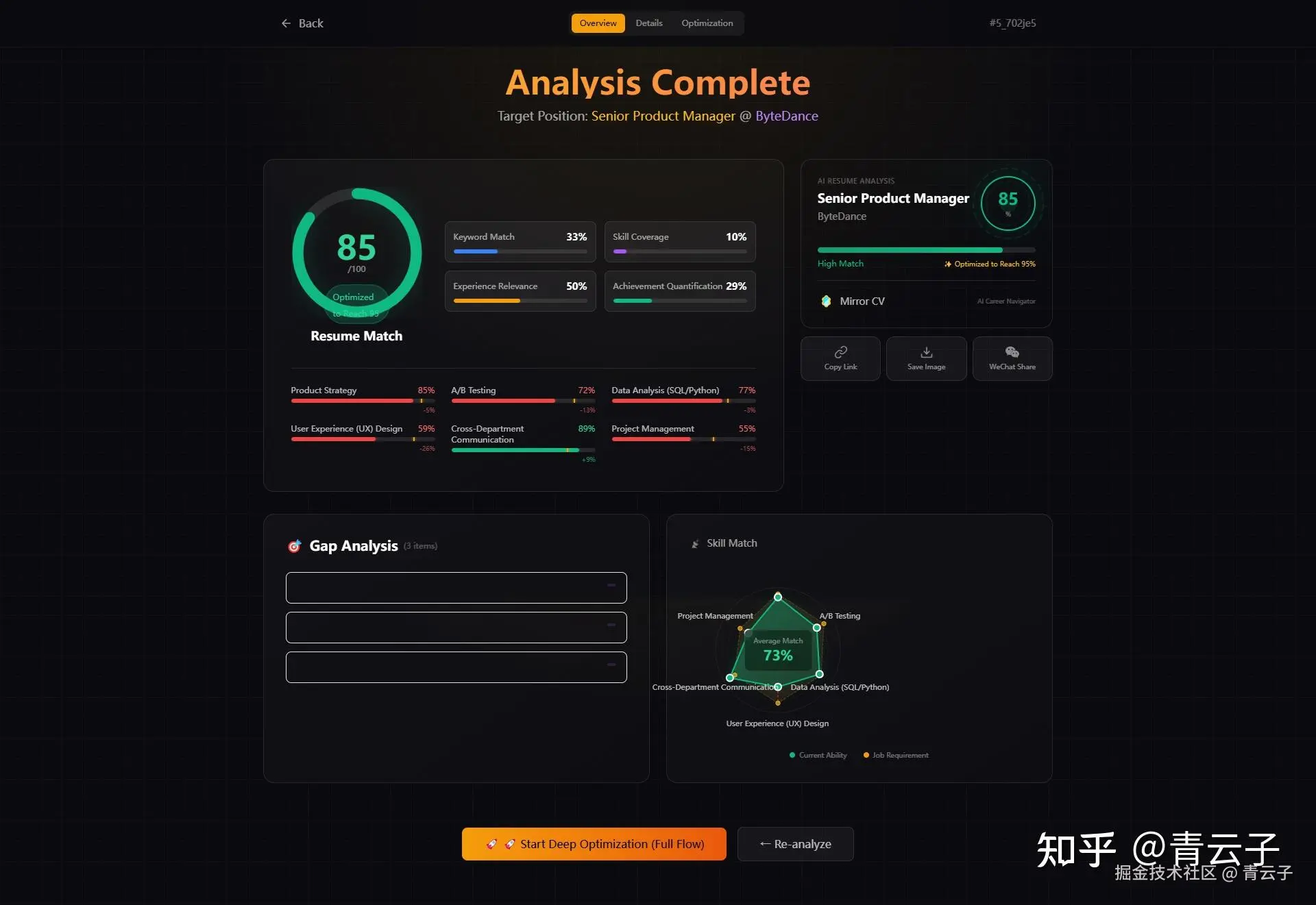 - 可迁移技能映射:专为转行人士量身打造,能将你看似与目标岗位无关的经验,转化为岗位所需的通用核心技能,让转行不再是简历的死胡同