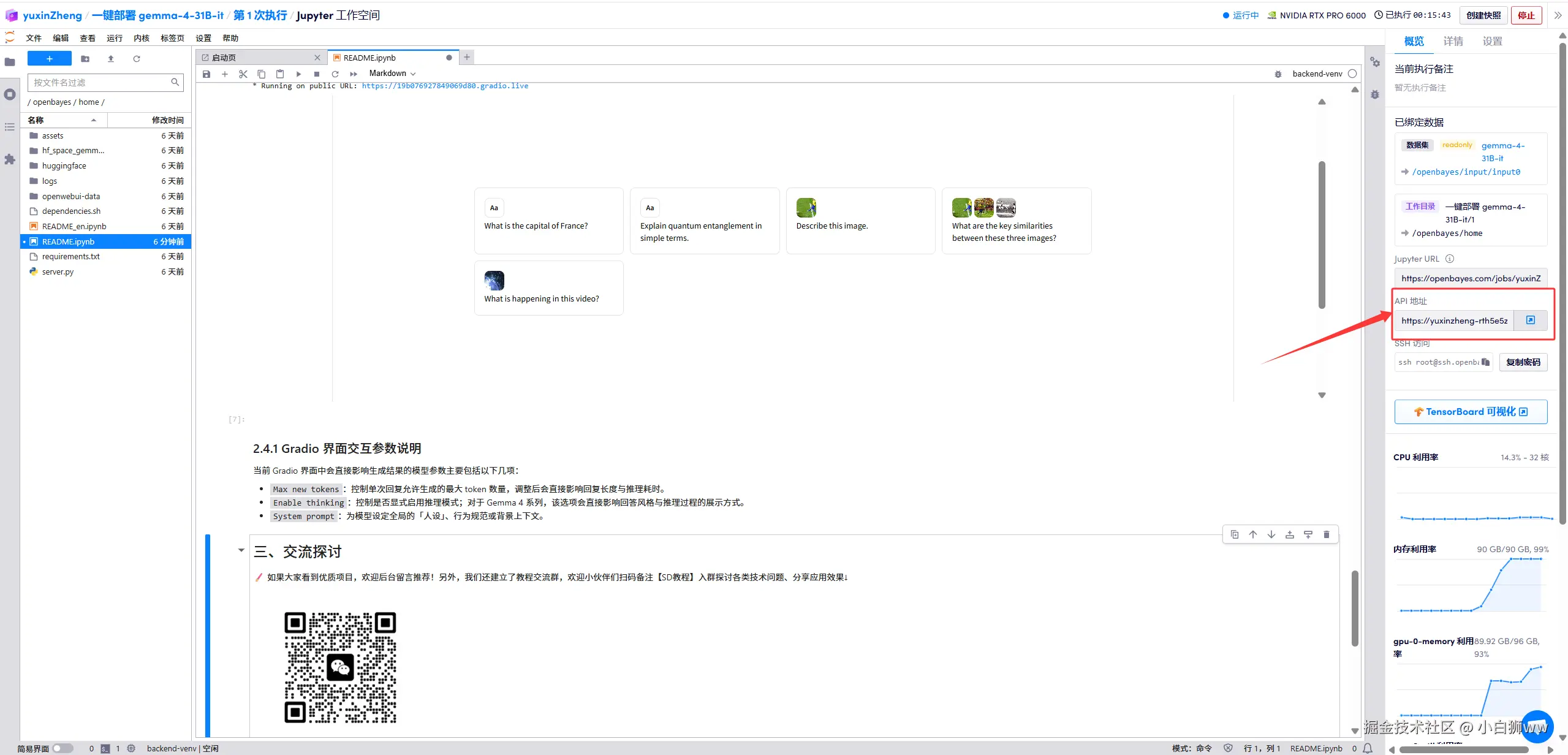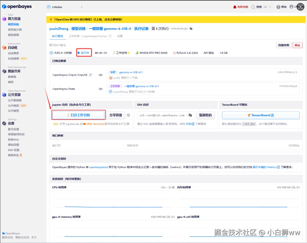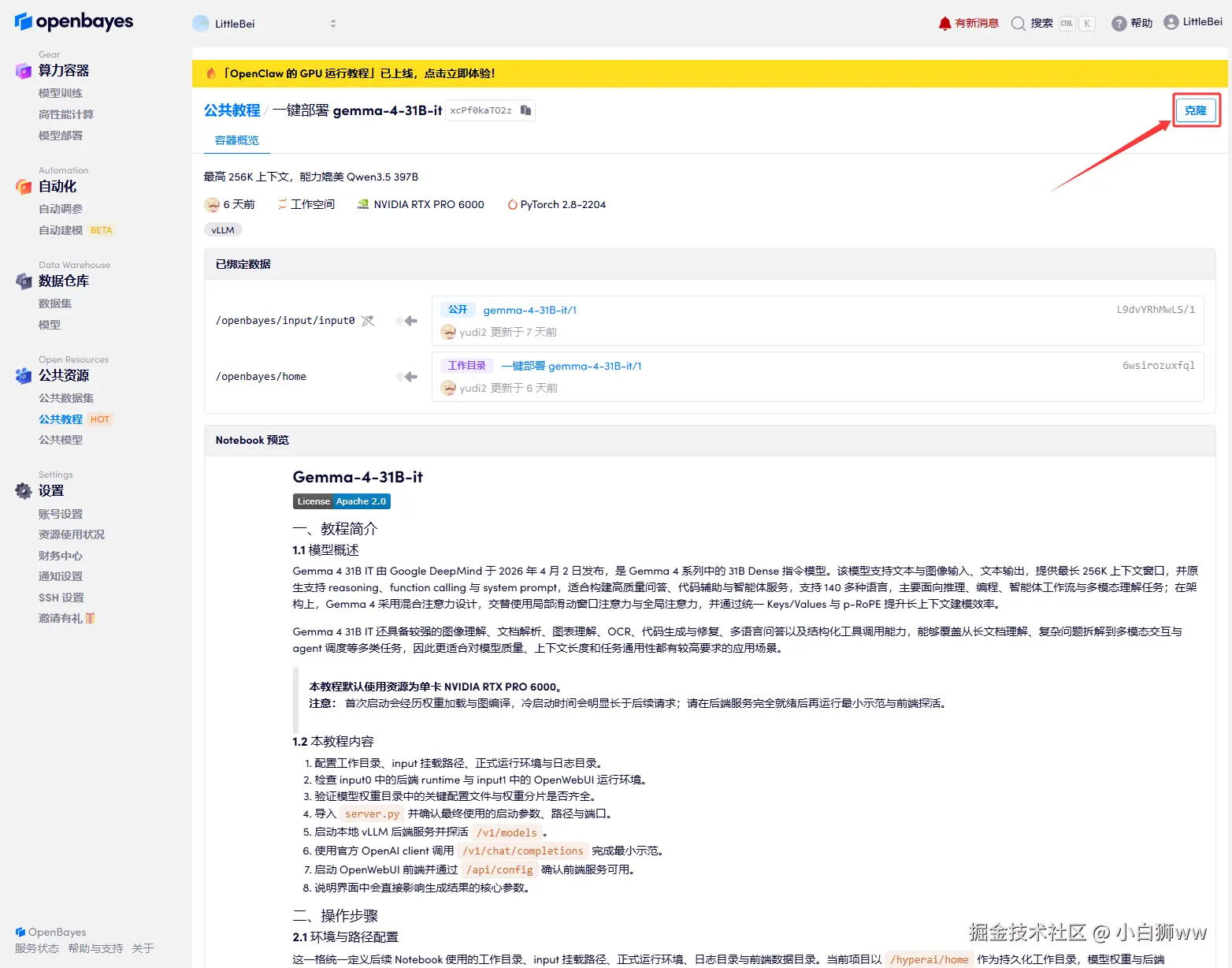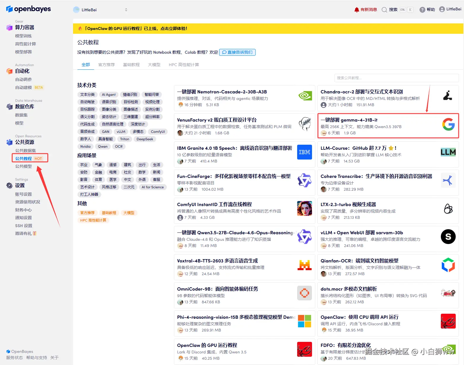 1.登录 OpenBayes.com,首先点击「公共教程」,找到「一键部署 gemma-4-31B-it」,单击打开。