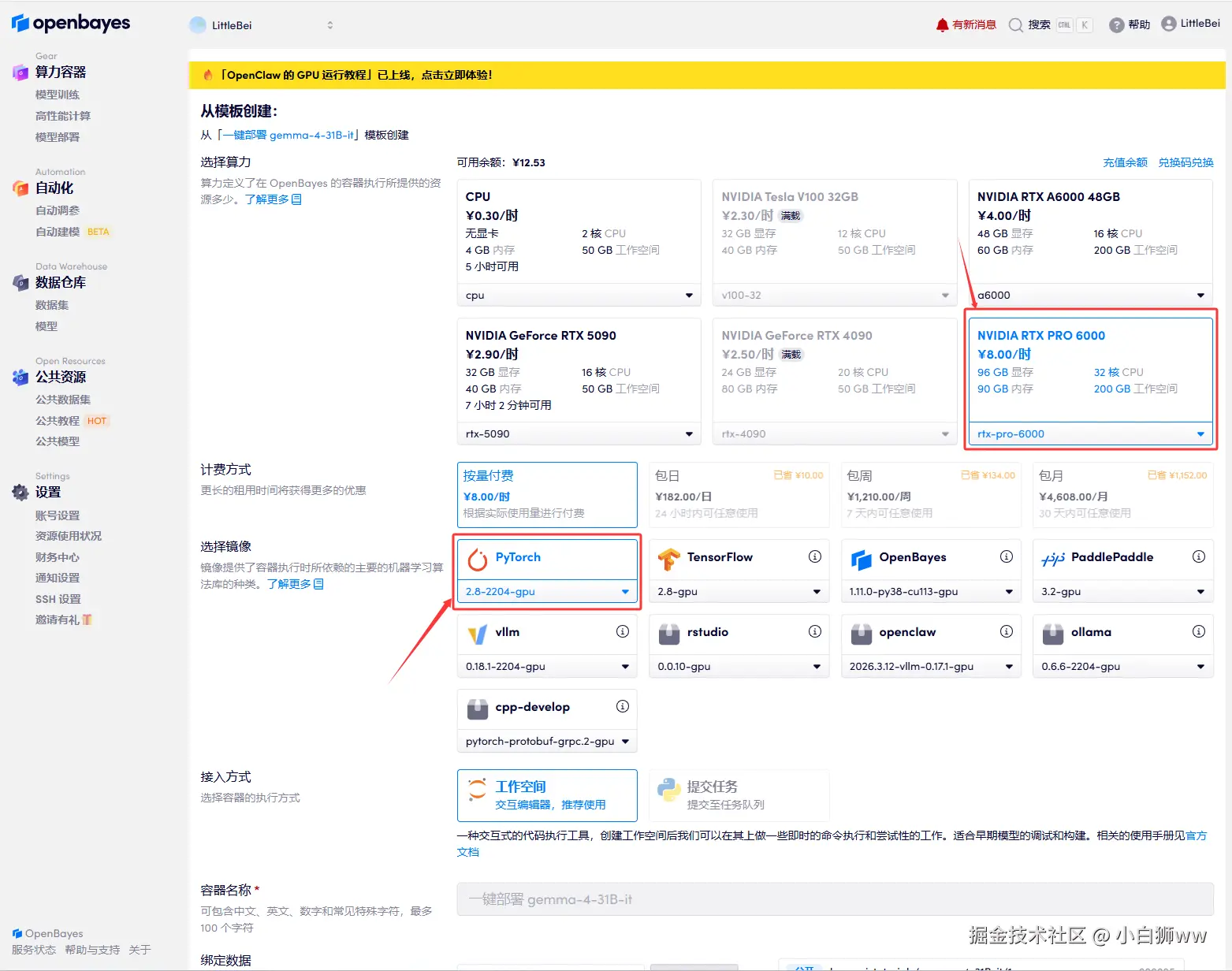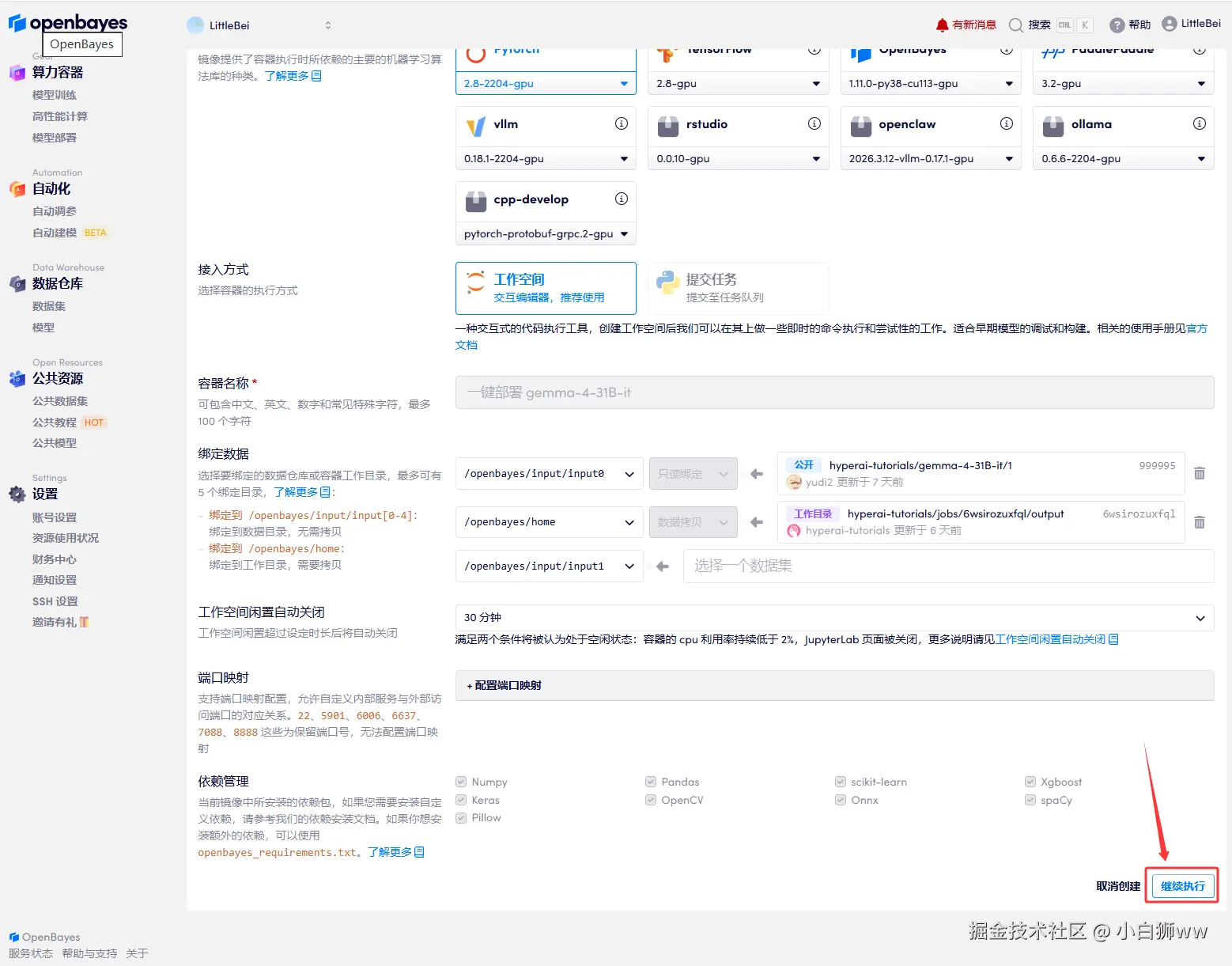 3.在当前页面中看到的算力资源均可以在平台一键选择使用。平台会默认选配好原教程所使用的算力资源、镜像版本,不需要再进行手动选择。点击「继续执行」,等待分配资源。