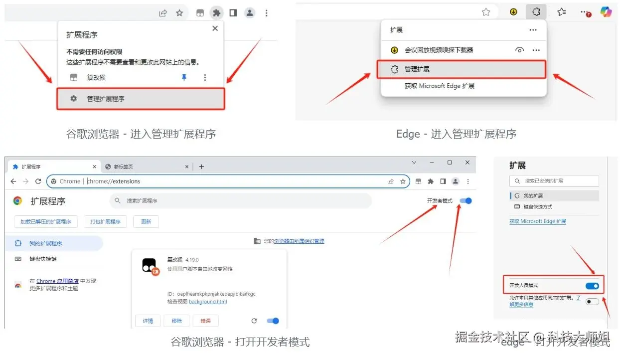 浏览器插件支持edge和chrome浏览器,以及内核为chrome的国产开发浏览器 打开浏览器扩展管理,微软Edge和谷歌浏览器的方法如下