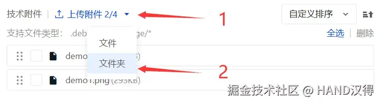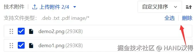 过去,如果用户需要删除多个附件,只能一条条点击删除。文件列表过多时,操作比较繁琐低效。 这次新增配置: enableDeleteAll :支持批量勾选 + 一键删除