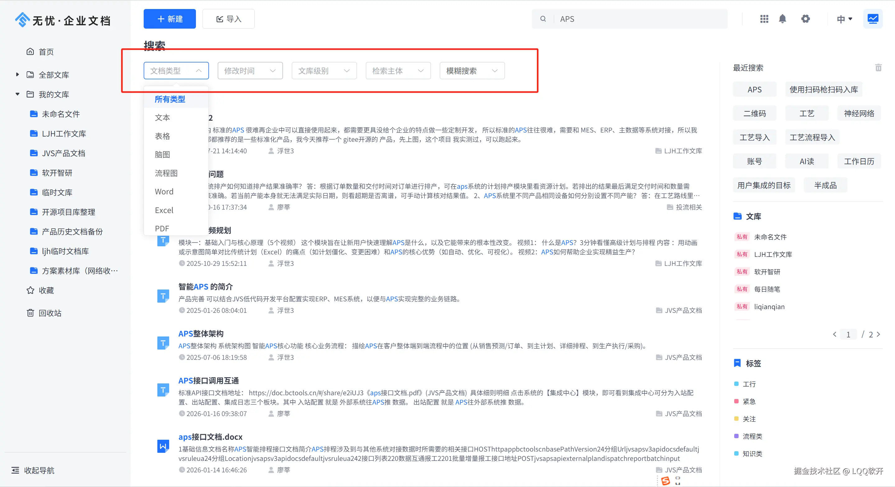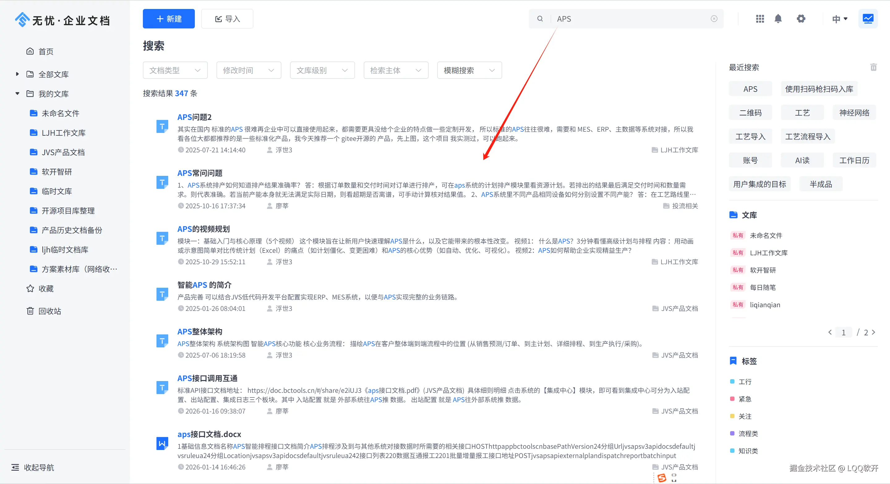 • 内置高效全文检索能力,覆盖文件标题、正文内容,甚至可识别图片中的文字信息,在权限范围内实现精准匹配,无需反复翻找