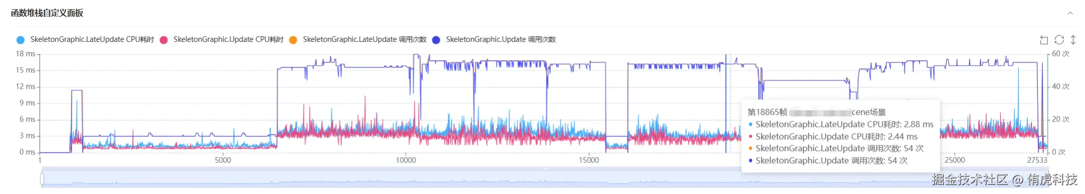 A:从GOT Online的报告中可以看到,进入游戏场景后Update和LateUpdate的调用次数达到50个以上,它其实反映了场景中激活状态的Spine组件数量,首先我们要定位下具体的来源,检查有没有预期之外的。