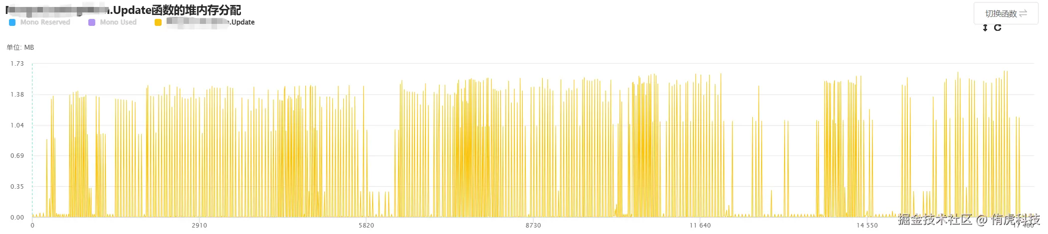另外还看到在三消的场景中,GC.Collect的调用频率比较高,从Mono报告能看到有个函数会以非常高的频率进行分配,且每次分配1MB以上的堆内存,主要是Json相关的数据写入序列化等。