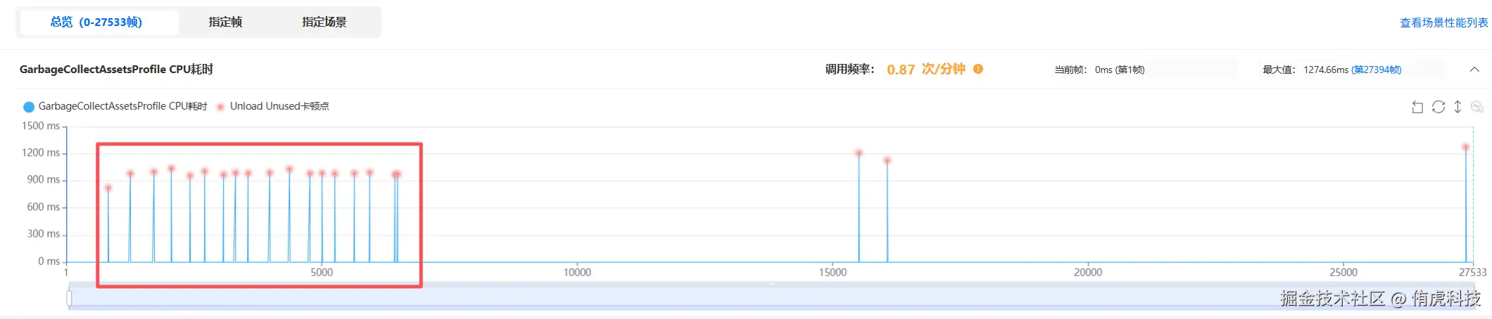 首先是GarbageCollectAssetsProfile这个节点,也就是在调用Resource.UnloadUnusedAssets时触发垃圾回收的开销,在这个类似主城的场景里它的调用频率非常高,每隔几百帧就会触发一次,这是不太合理的。Unity中本身有一个机制,在LoadScene的时候会自动调用Asset垃圾回收,所以一般不需要手动去触发。不过也有一些像这种没有去做LoadScene切场景,不会有自动的调用,有的项目会选择用定时器的方式去手动调用,一般控制在5~10分钟调一次,还有的项目会放在触发内存报警Low Memory的时候主动调用,或者还有在场景切换前后这种明确的节点,主动调用。其他时候尽量还是要避免频繁调用,不然会造成非常多的卡顿。