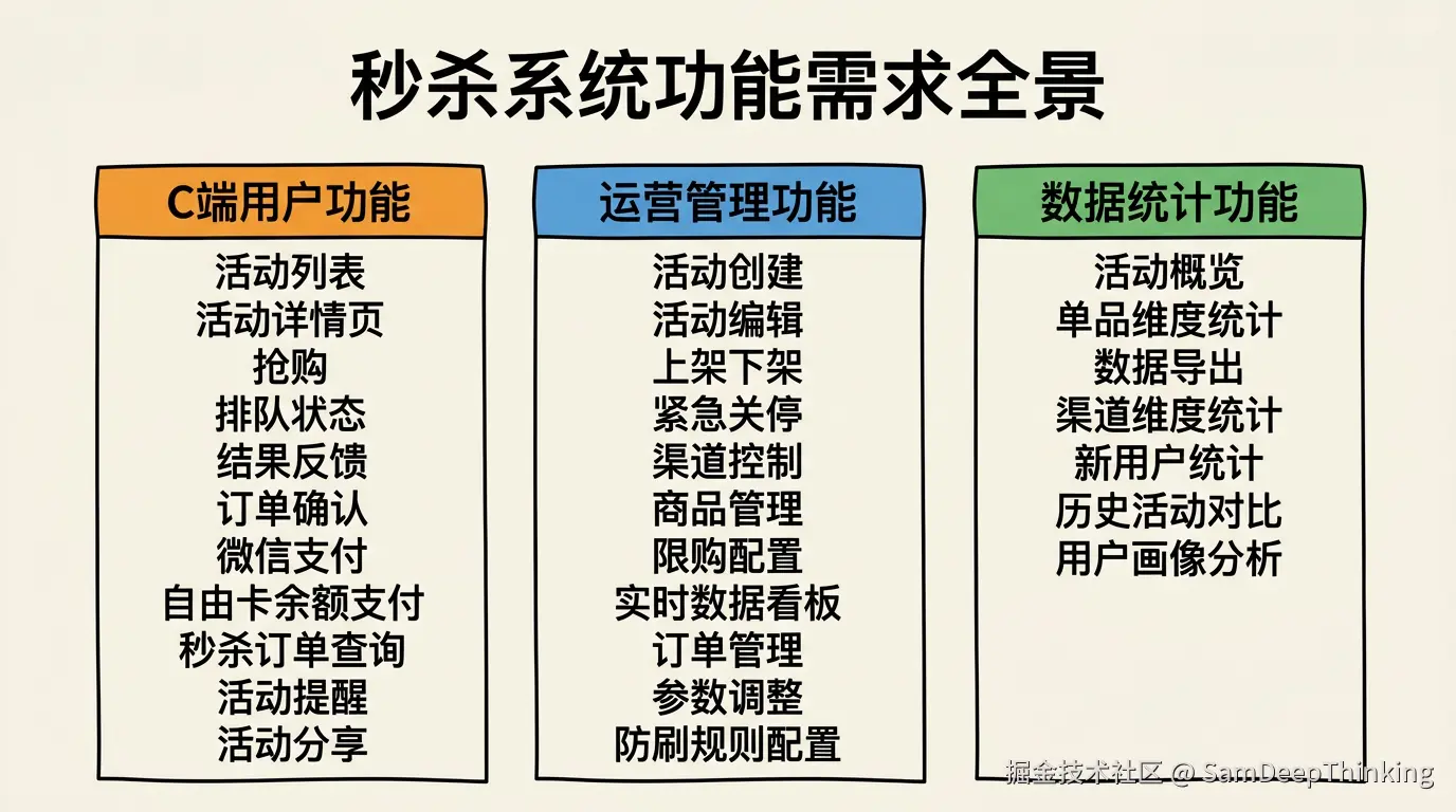 第一次自由卡促销活动把核心交易系统打挂了。这件事之后,CTO拍板要做一套独立的秒杀系统。在写代码之前要先理清楚业务层面的问题: