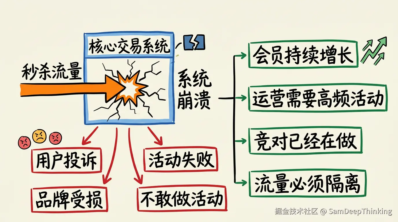 运营团队目前的处境是:每次想做活动,都要拉技术负责人和运维一起评估系统是否扛得住,评估完还不一定敢放量。独立的秒杀系统上线后,运营的活动排期可以从「技术允许什么时候做」变成「业务需要什么时候做」。