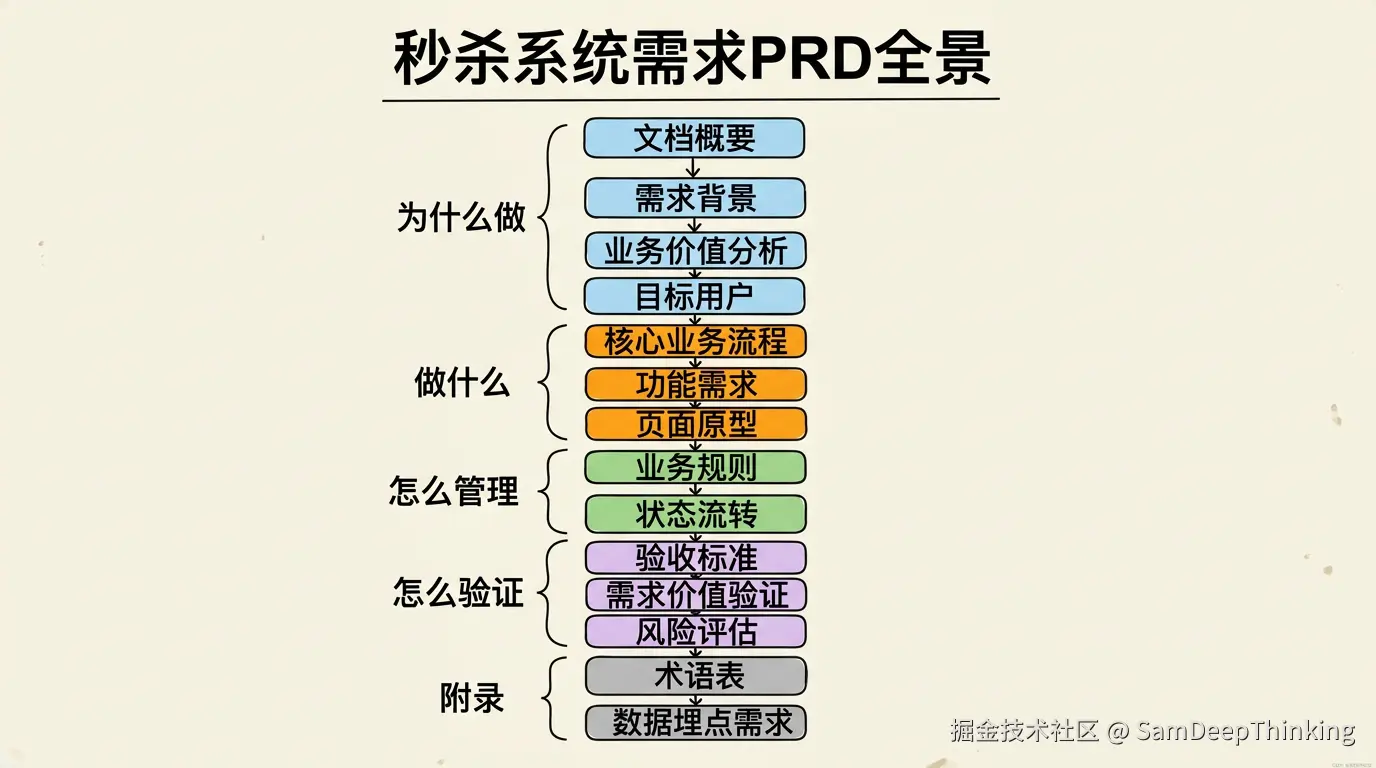比如产品要求「秒杀活动不能影响正常交易」,看过这份PRD里的事故背景和业务价值分析,就知道这不是一个可商量的选项,而是一条不可退让的红线。技术方案里关于流量隔离的设计、关于紧急关停的响应时间要求,都从这条红线推导而来。