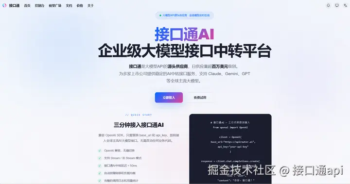 “接口通”是一个专业的 AI 模型分发平台,它通过合规渠道接入 Anthropic 官方原始 API,并将其转化为国内环境下可直接调用的标准接口。