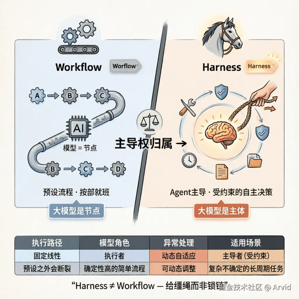 区别在于主导权是谁。Workflow 把大模型当成节点,按预设流程 A→B→C 执行;Harness 把大模型当成主体,给它自主决策的空间但套上缰绳。基础模型越来越强的当下,Harness 更能发挥模型能力,同时确保不过失。