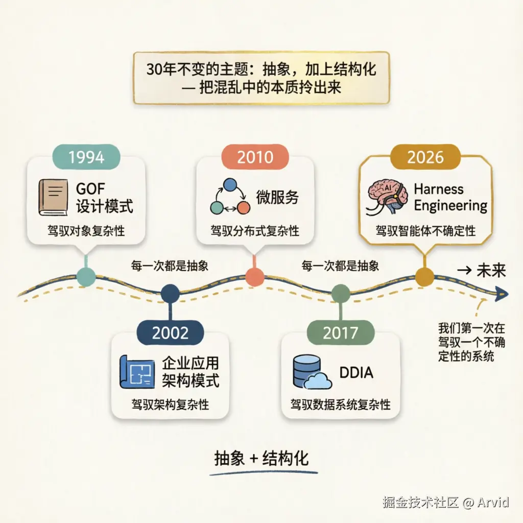 贯穿三十年的不变主题是抽象。加上结构化,把混乱中的本质拎出来——设计模式是抽象,微服务是抽象,云计算是抽象,Harness 也是抽象。