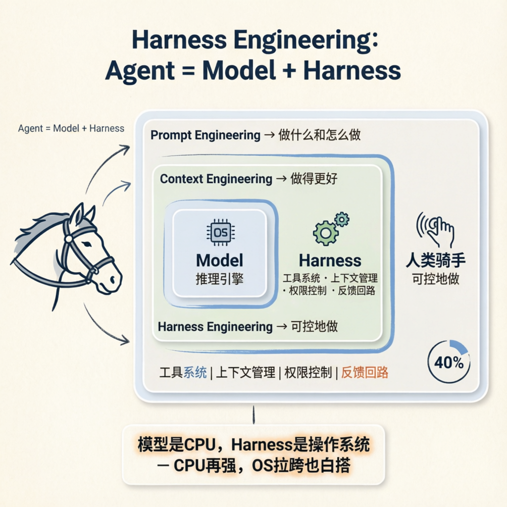 这个术语背后的东西其实一句话就能说清:Agent = Model + Harness。模型负责推理,剩下的全部是工程——工具系统、上下文管理、权限控制、反馈回路。过去大家以为瓶颈在模型不够聪明,现在发现错了:瓶颈在外围工程。