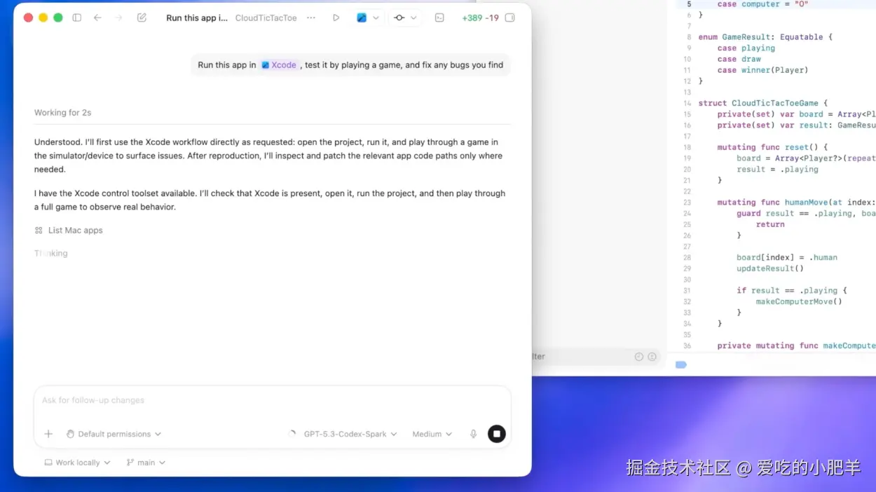 演示里给的场景是这样的:Codex 在 Xcode 里编译了一个井字棋游戏,自己跑起来玩了一轮,发现人类下完一步之后电脑能直接下两步,定位到代码里的分支逻辑有 bug,改掉,再跑一遍验证。