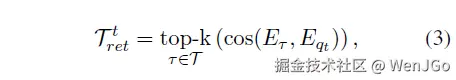 在检索阶段,模型不是直接输出工具 ID,而是先生成一个 <search> ... </search> 查询,再让检索服务器用预训练 embedding 模型把查询编码,和工具向量做余弦相似度,返回 top-k 候选工具。这个过程对应式 (3)。