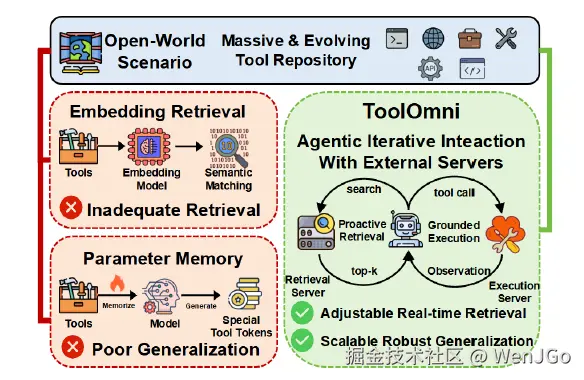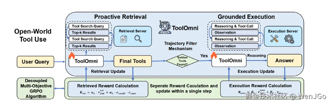 过去的方法,要么把工具检索做成静态前处理,要么把工具知识硬塞进模型参数。前者不够主动,后者不够泛化。于是作者提出 ToolOmni,把“主动搜工具”和“基于工具执行”统一到一个 reasoning loop 里;再通过“先 SFT 冷启动、后 decoupled multi-objective GRPO 强化”的两阶段训练,让模型既会找工具,也会用工具。实验表明,它在开放世界大工具库上的检索更准,在端到端工具执行上也更强,而且对新工具、新类别、噪声工具都更稳。