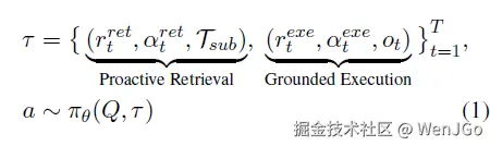 作者用式 (1) 表示:在每个 turn,agent 先做 proactive retrieval,再做 grounded execution,最终根据问题 Q 和轨迹 生成答案 a。