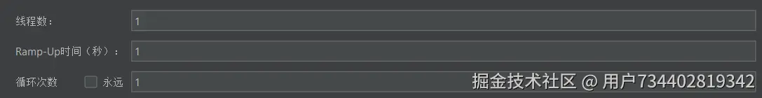 (3)循环次数:每个线程发送请求的个数。如果线程数为20,循环次数为10,那么每个线程发送10次请求。总请求数为20*10=200。如果勾选了“永远”, 那么所有线程会一直发送请求,直到手动点击工具栏上的停止按钮,或者设置的线程时间结束。