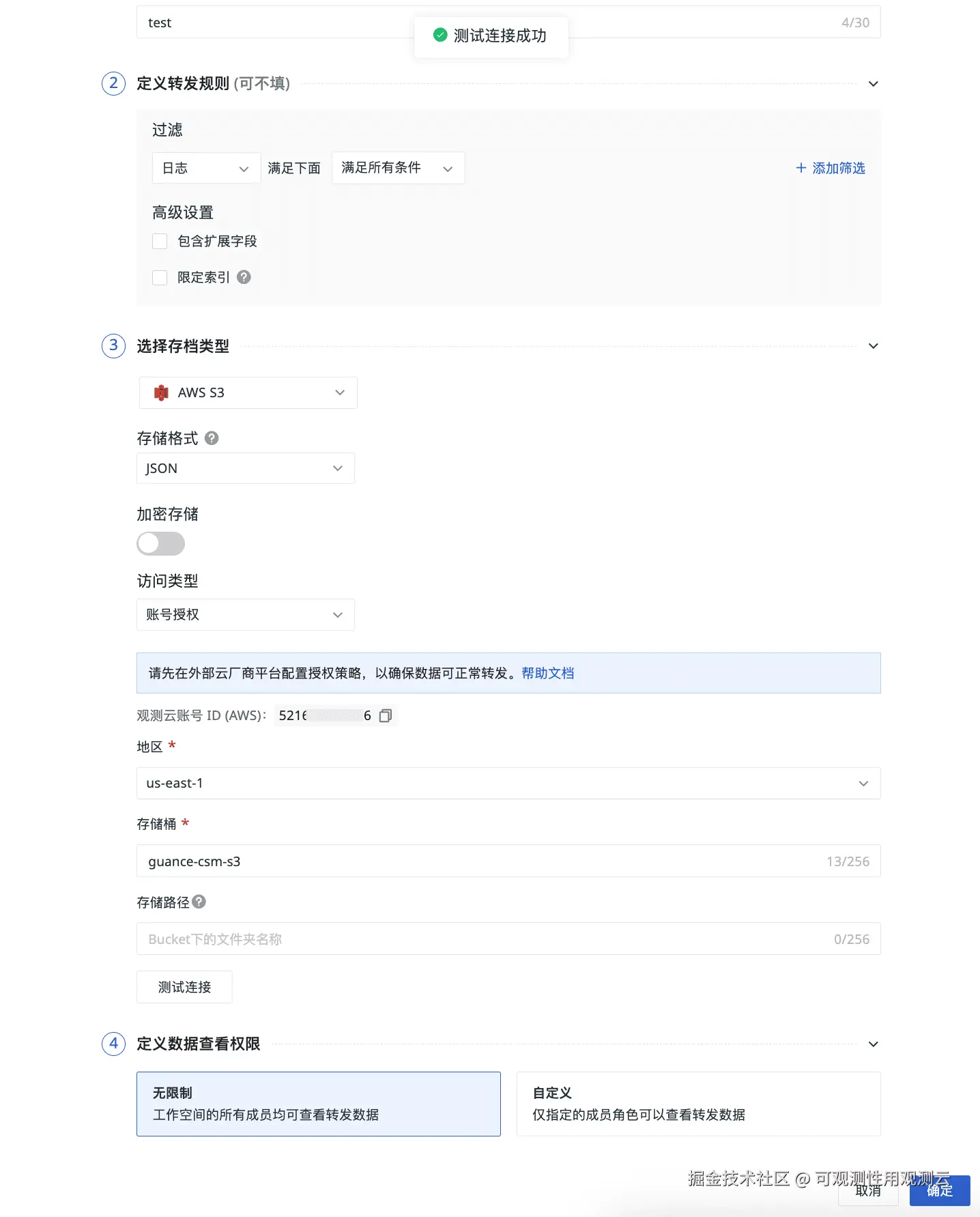 AccessDenied,请核对策略是否包含PutObject、ListBucket、GetBucketLocation。 - 桶区域与观测云规则填写区域不一致会导致连接测试失败。