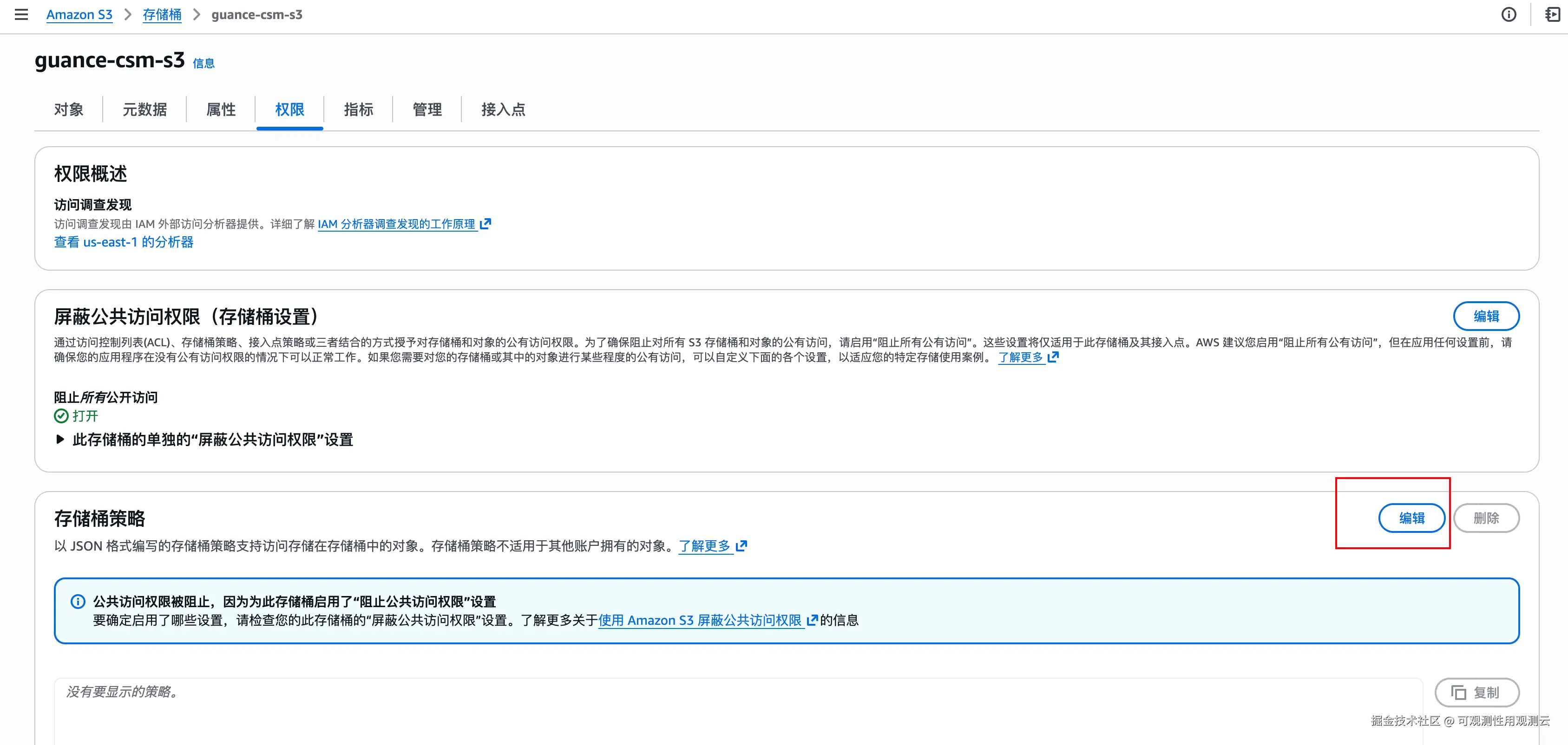 在 S3 桶的“权限”页编辑桶策略,填入观测云账号 ID 和目标桶 ARN。