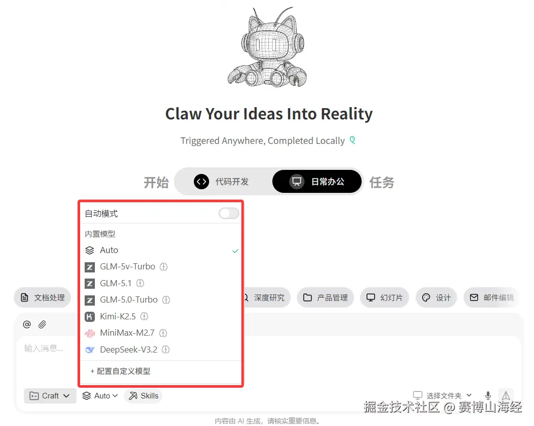 WorkBuddy 支持混元、DeepSeek、GLM、Kimi、MiniMax 等主流国产 AI 模型,可以按任务类型选择最合适的模型。