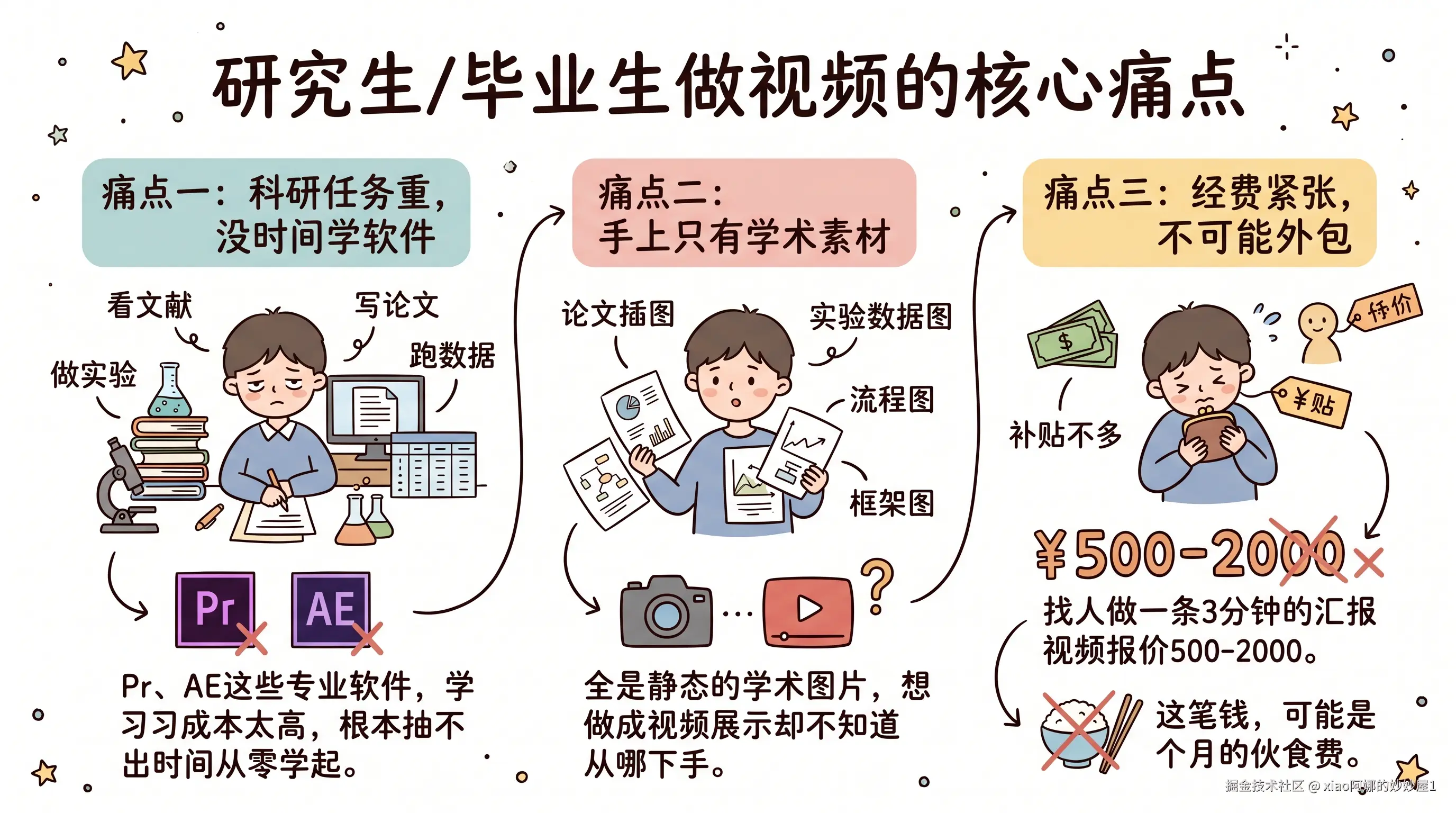 研究生的日常是看文献、做实验、写论文、跑数据……Pr、AE这些专业软件,学习成本太高,根本抽不出时间从零学起。
