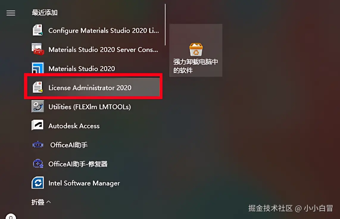 20.回到桌面,点击任务栏的【开始菜单】,在【所有应用】中找到【License Administrator 2020软件图标】,点击打开它。