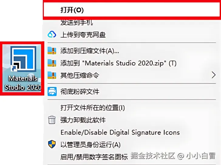 27.右键桌面上的【Materials Studio 2020软件图标】,点击【打开】。