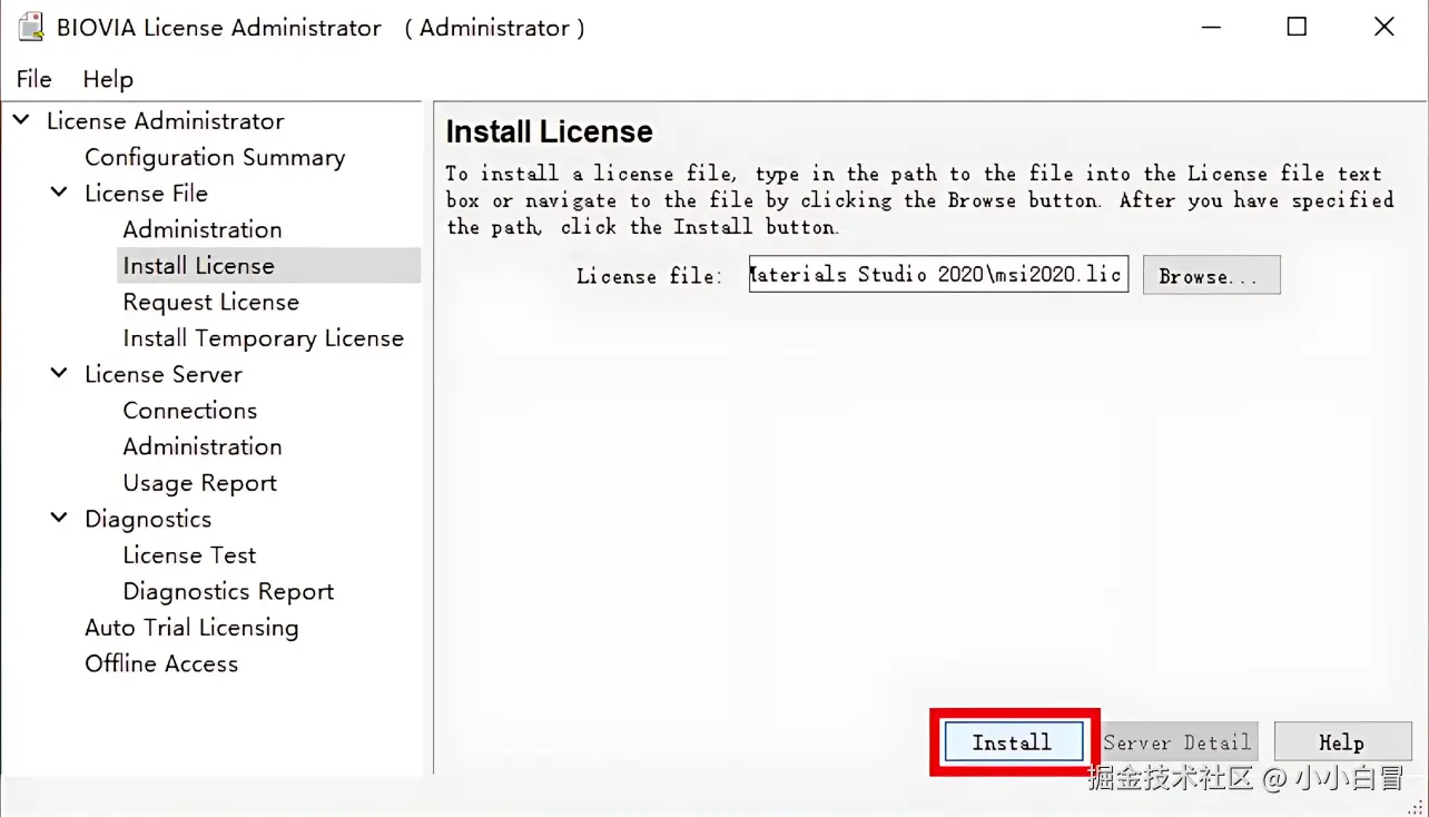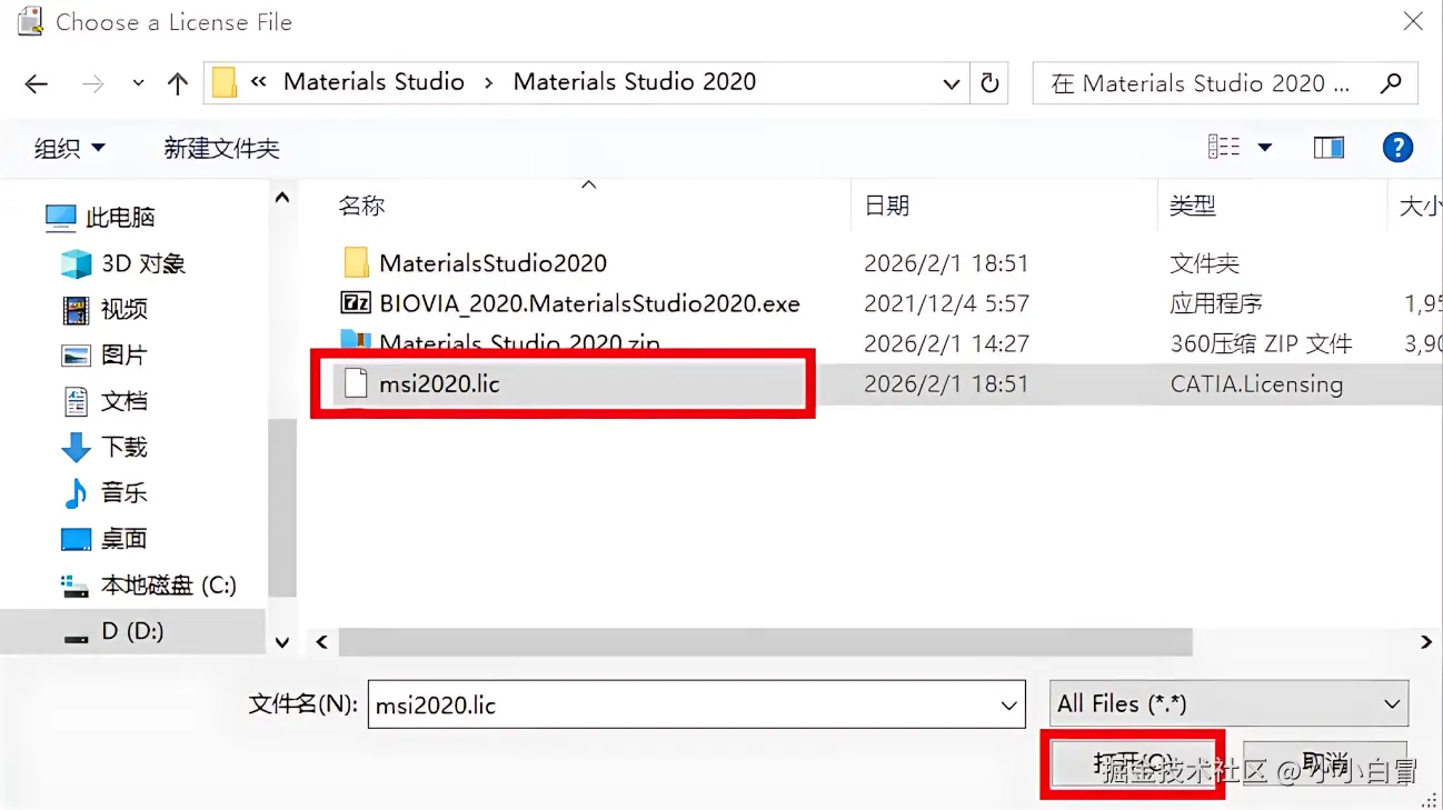 22.找到并选中Materials Studio 2020文件夹下的【msi2020.lic】文件,再点击【打开】。