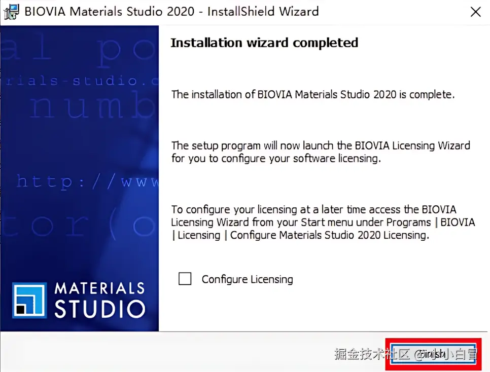13.不勾选【Configure Licensing】,再点击【Finish】。