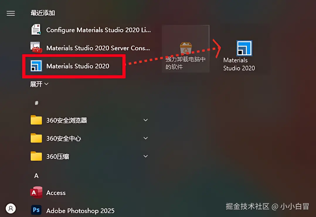 26.回到桌面,点击任务栏的【开始菜单】,在【所有应用】中找到【Materials Studio 2020软件图标】,将软件图标拖到桌面上,完成软件桌面快捷方式的创建。