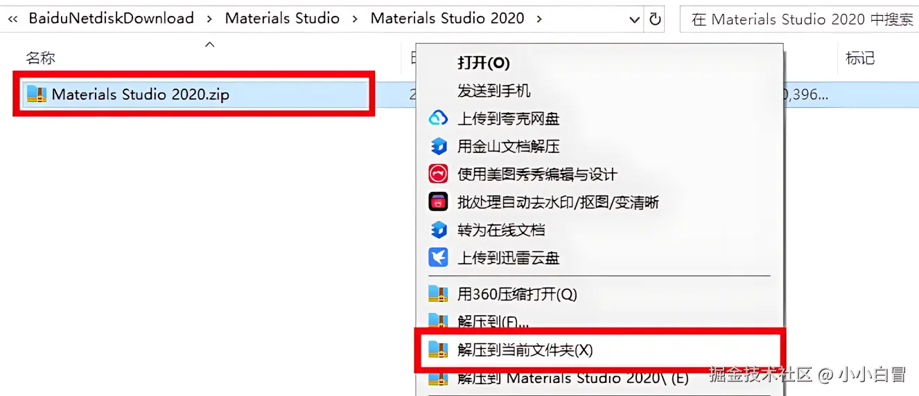 1.下载Materials Studio 2020软件安装包到电脑上,右键选择【解压到当前文件夹】。