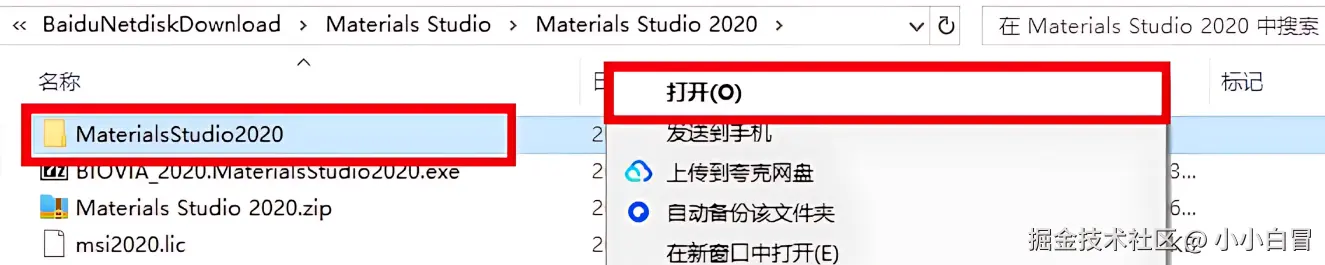 2.找到【MaterialsStudio2020】文件夹,右键选择【打开】。
