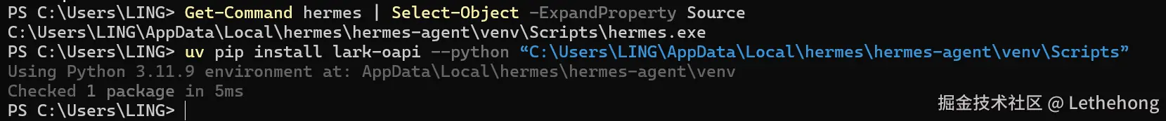 在 PowerShell 中,先找到 Hermes 的藏身之处,再用 uv 精准投递依赖: